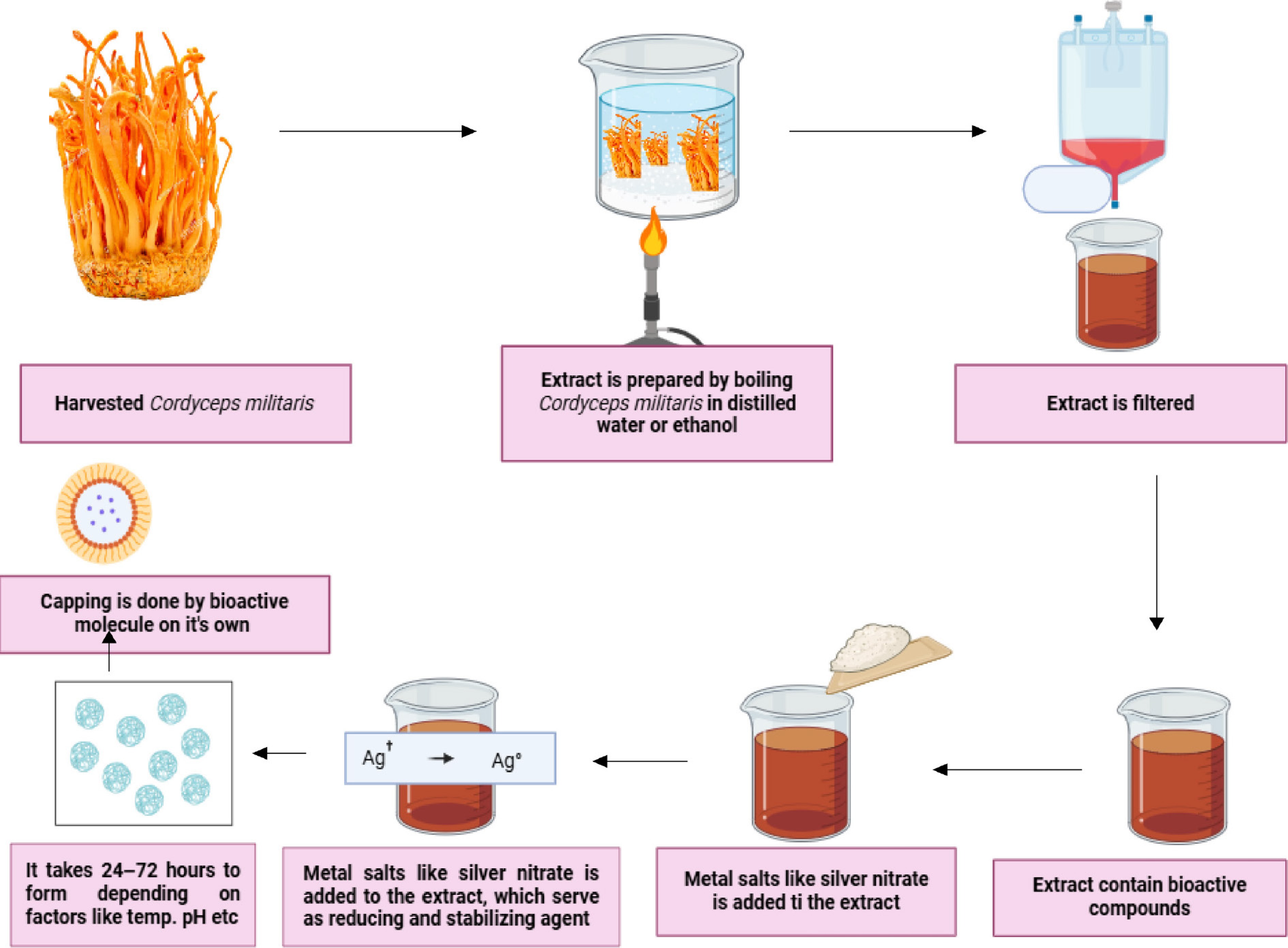 Due to their antimicrobial properties, C. militaris can be utilized to produce environmentally friendly nanoparticles that serve as a biological control mechanism against plant pathogens, thereby safeguarding plants from diseases. Nanoparticles are minuscule materials measuring between 1 and 100 nm and can be classified into various categories, including metal nanoparticles such as silver and gold, metal oxides like zinc oxide and titanium dioxide, carbon-based nanoparticles including fullerenes and nanotubes, as well as polymeric and lipid-based nanoparticles. Additionally, these nanoparticles can be categorized based on their origin (natural or synthetic), composition (inorganic, organic, or hybrid), shape (spherical, rod-like, etc.), and dimensionality (0D, 1D, 2D, or 3D structures)[62]. Among the different types, green nanoparticles have gained attention as a viable alternative due to their eco-friendly synthesis methods. These nanoparticles are produced using biological resources such as plant extracts, microorganisms (including bacteria and fungi), algae, or agricultural waste. These natural materials function as reducing and stabilizing agents, thereby eliminating the necessity for toxic chemicals and high-energy inputs typically associated with conventional chemical synthesis techniques. Green nanoparticles are regarded as more advantageous than traditionally synthesized nanoparticles for various reasons. They are non-toxic, biodegradable, biocompatible, and created through sustainable practices, making them particularly ideal for use in medicine, agriculture, and environmental cleanup[13]. Additionally, their production costs are considerably lower since green synthesis employs plentiful and renewable biological materials, often derived from waste (Fig. 6). The process of creating green nanoparticles generally involves extracting bioactive compounds from natural sources like plant leaves or fruit peels, which are then combined with a metal salt solution. These natural compounds facilitate the reduction of metal ions to form nanoparticles while also stabilizing them. The final nanoparticles are purified through methods such as filtration or centrifugation. This straightforward, cost-effective, and environmentally friendly approach aligns with the principles of green chemistry and presents a promising avenue for future applications in nanotechnology[14].