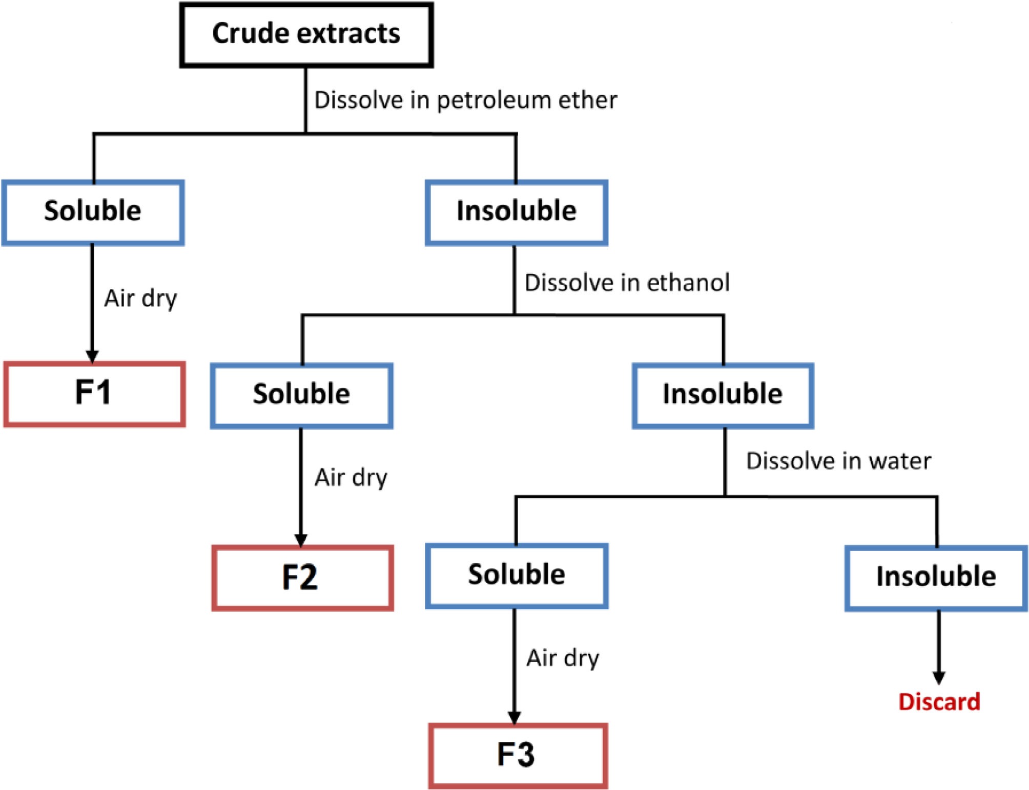 The combined extracts were partially evaporated using a rotary evaporator and then air-dried. The resulting crude extract was subsequently subjected to sequential solvent fractionation by washing with petroleum ether, ethanol, and water (Fig. 2) to separate metabolites based on polarity. This process yielded three fractions: F1 (petroleum ether-soluble), F2 (ethanol-soluble), and F3 (water-soluble). All fractions were air-dried, weighed, and stored at 15 °C until further analysis.