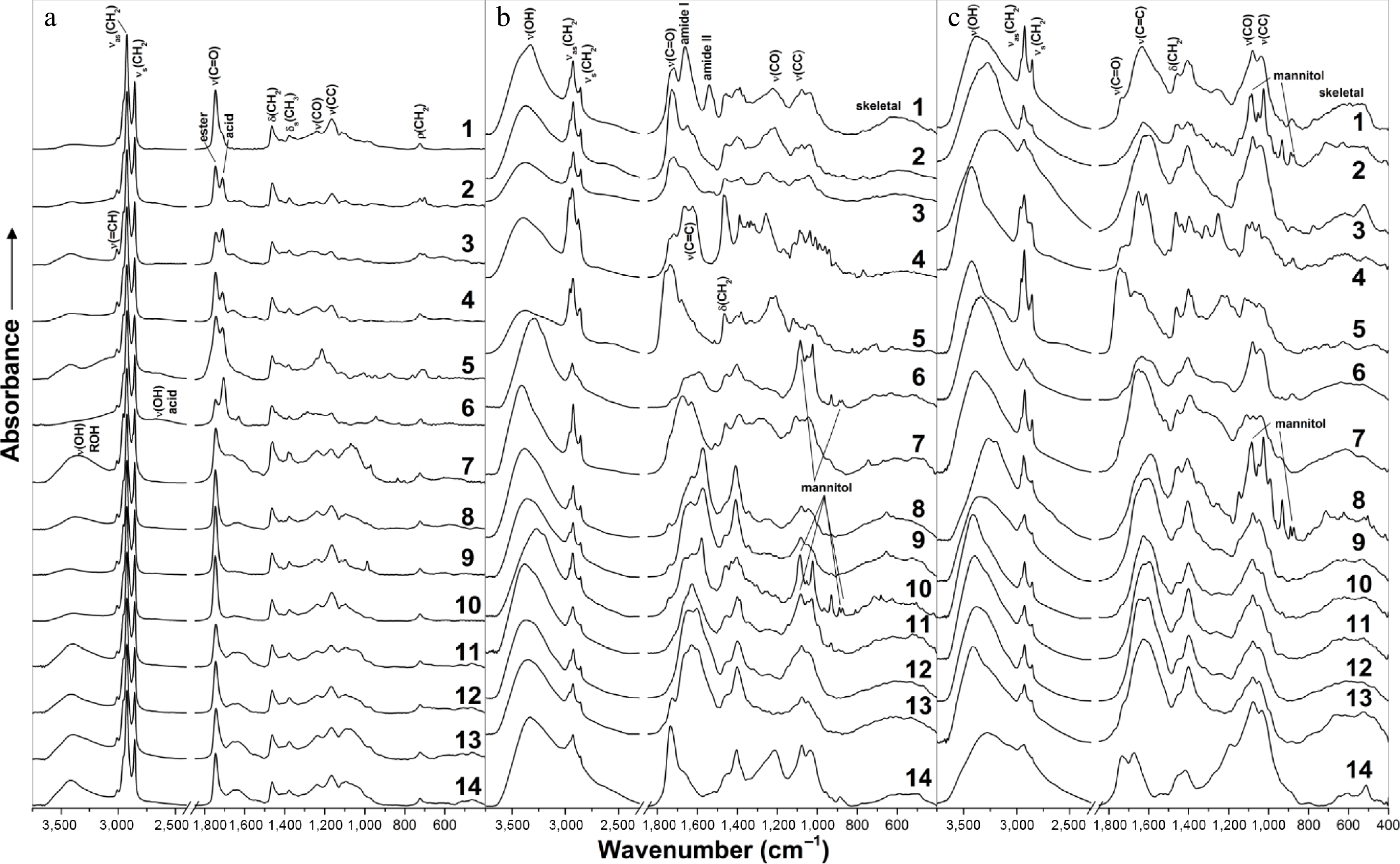 FTIR spectra of F1 fractions (petroleum ether-soluble) revealed characteristic bands of lipids, primarily triacylglycerols and free fatty acids (Fig. 3a)[12,13]. Prominent methylene stretching vibrations were observed at 2,925 and ~2,854 cm−1, with additional CH2 bands at 1,462–1,465 cm−1 (scissoring) and ~722 cm−1 (rocking). Methyl group vibrations were less intense, with bands at ~2,955 (antisymmetric stretch), ~1,440 , and ~1,378 cm−1 (bending). Carbonyl stretching bands appeared at 1,742–1,746 cm−1 and 1,706–1,711 cm−1, corresponding to esters and free fatty acids, respectively. The ratio of these two bands reflected the relative abundance of fats vs free fatty acids and varied between fungal strains. For instance, esters predominated in F1 from fungi no. 8–13, while F1 from Fusicoccum aesculi MFLU10-0266 (fungus no. 6) contained more free fatty acids. Ester C–O stretching was also evident at 1,235–1,246 cm−1 and 1,163–1,169 cm−1.