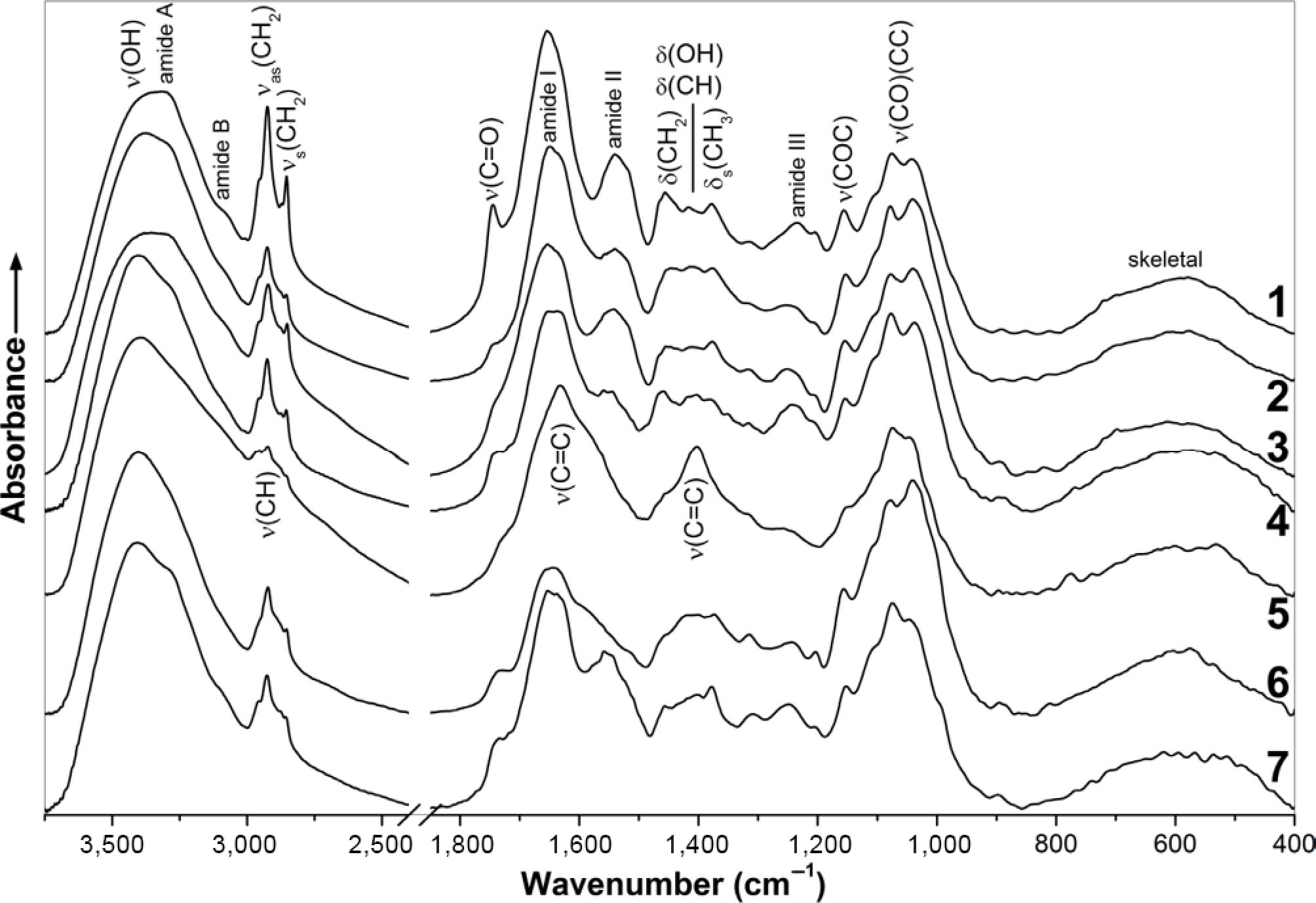Pure mycelia from fungi no. 1–7 were collected post-extraction for FTIR analysis (Fig. 4). The spectra confirmed the presence of structural biopolymers, predominantly proteins and polysaccharides[21−23]. In Trichoderma sp. DBM4197 (fungus no. 1), strong protein-associated bands were observed at 3,316 cm−1 (amide A), 3,100 cm−1 (amide B, shoulder), 1,655 cm−1 (amide I), 1,541 cm−1 (amide II), and 1,234 cm−1 (amide III), along with lipid signals at 2,925 cm−1, 2,854 cm−1, 1,746 cm−1, and 1,456 cm−1. Polysaccharide-rich spectra (1,200–950 cm−1) were most prominent in F. aesculi MFLU10-0266 (fungus no. 6), in Stachybotrys chartarum DBM4297 (fungus no. 4), and Chaetomium sp. MFLU10-0761 (fungus no. 7), the amide I band appeared split (~1,656 and 1,623–1,626 cm−1), and the amide II band was shifted to 1,558–1,560 cm−1—features characteristic of α-chitin, a major component of fungal cell walls[24,25]. Additional features of β-polysaccharides (e.g., chitin, β-glucans) were identified at 891–899, 1,377–1,380, 1,316–1,320, ~1,110, and ~1,040 cm−1. Notably, the mycelium of F. aesculi MFLU10-0260 (fungus no. 5) showed prominent bands at 1,631 and 1,402 cm−1, indicative of aromatic C=C stretching. These findings suggest that residual mycelia primarily consist of cell wall polysaccharides, with varying contributions from proteins, lipids, and aromatic compounds across fungal species.