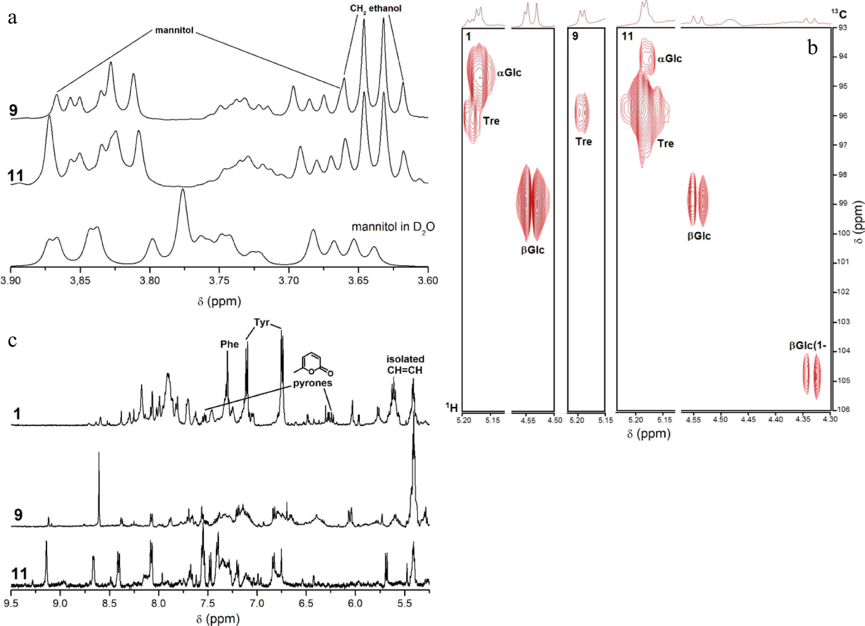 1H NMR and 1H, 13C HMQC spectra (600 MHz, CD3OD) of fractions F2 from the selected strains: the regions of (a) OCH, OCH2 protons in comparison with pure mannitol measured in D2O, (b) anomeric protons/carbons and aromatic protons. (c) Key signals of NMR spectra in the F2 fractions from Trichoderma sp. DBM4197 (no. 1) were annotated: aromatic protons (δ 7.15–7.35 ppm, Tyr/Phe), pyrone ring protons (δ 6.21 and 6.45 ppm, 6-substituted pyrones), olefinic protons (δ 5.80–6.00 ppm).