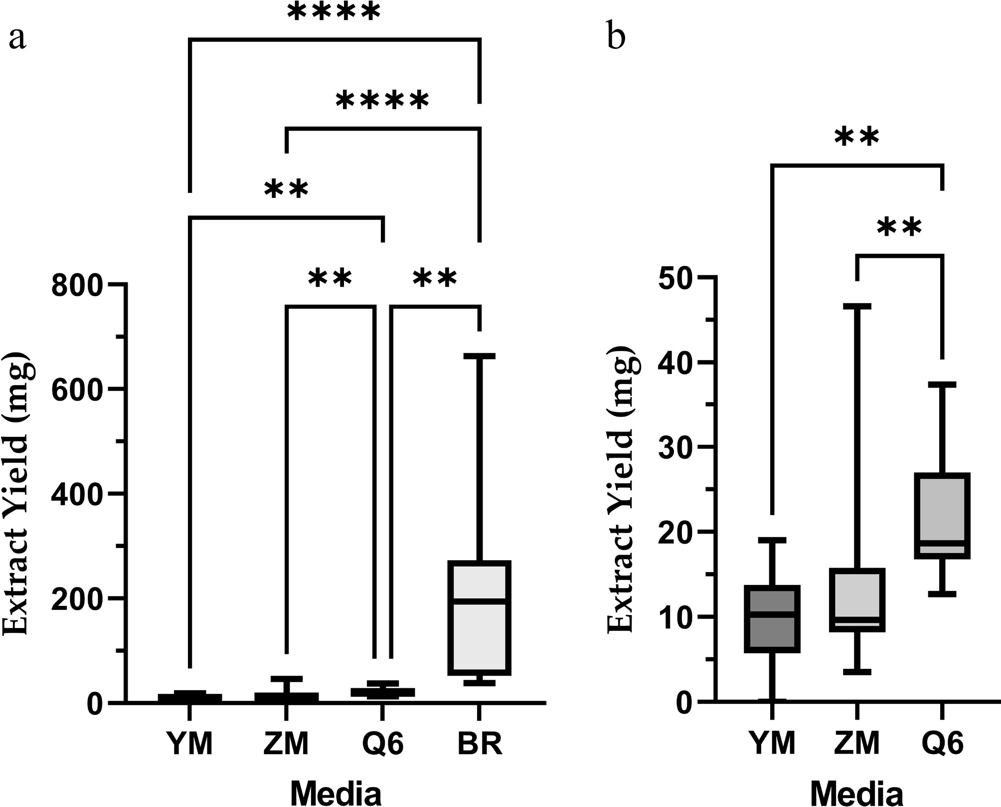 The normality of extract yield across media was assessed using the Shapiro–Wilk test. Further statistical analysis was carried out using the Kruskal–Wallis test to assess differences in secondary metabolite production across culture media, followed by a multiple comparisons test via two-stage linear step-up procedure of Benjamini, Krieger, and Yekutieli (BKY) to identify specific group differences.
