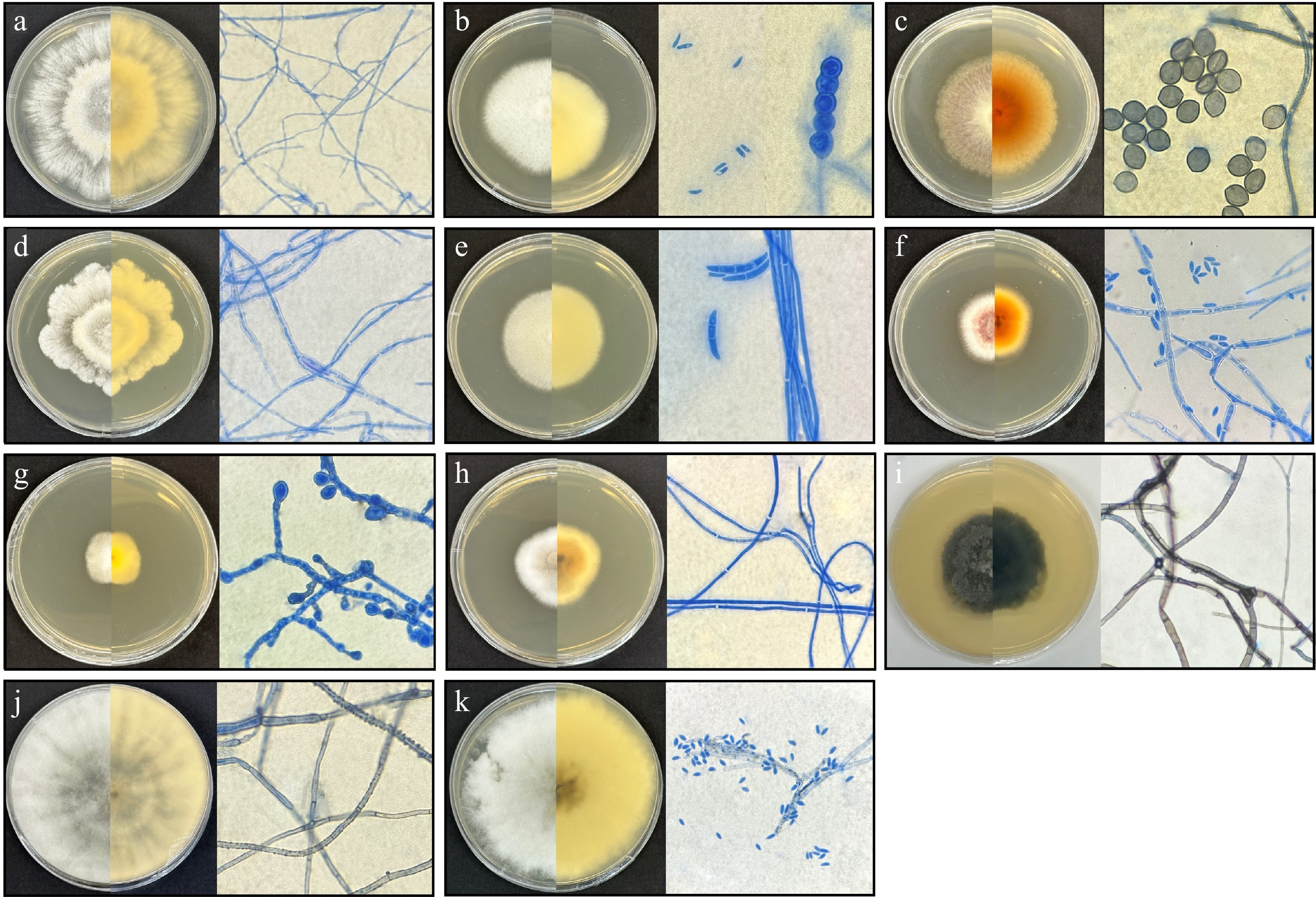 Culture morphology and microscopic morphology of active endophytic fungi observed under a compound light microscope at 1,000× magnification (oil immersion objective). (a) NA-001-Lv-C. (b) NA-001-Lv-D. (c) NA-001-Lv-E. (d) NA-001-Lv-F. (e) NA-001-Lv-G. (f) NA-001-St-B. (g) NA-001-St-D. (h) NA-001-St-H. (i) NA-002-Lv-X. (j) NA-002-St-C. (k) NA-003-St-C.