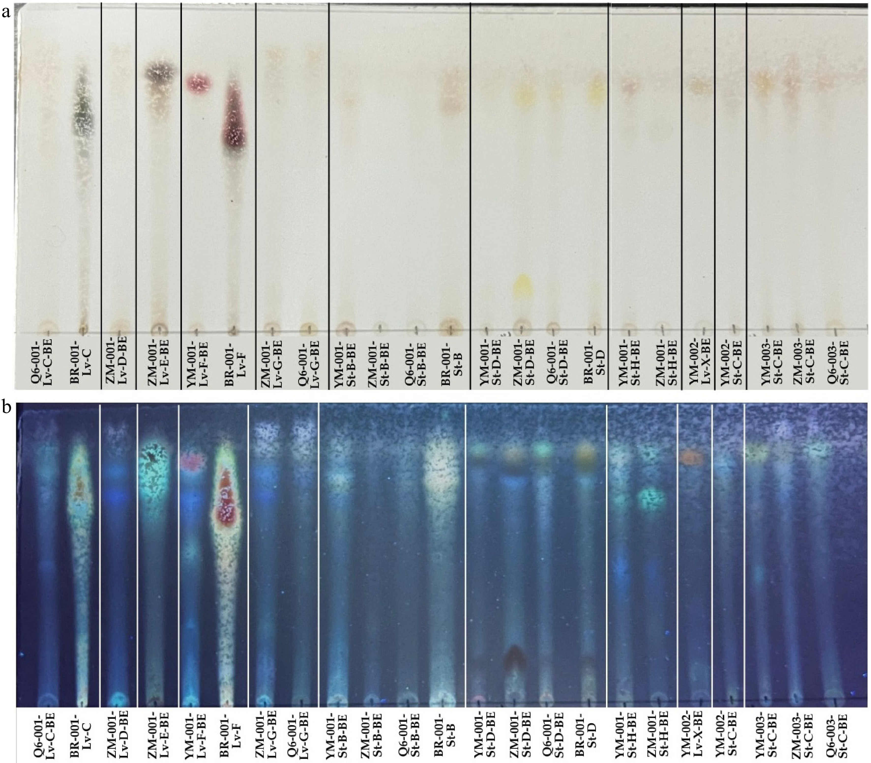 TLC profile of active crude fungal extracts. The TLC plate was viewed under (a) visible light, and (b) 365 nm using 7:2 EtOAc-MeOH solvent system and ethanol sulfuric acid spray reagent for derivatization. Active extracts were separated per fungal isolates by solid lines.