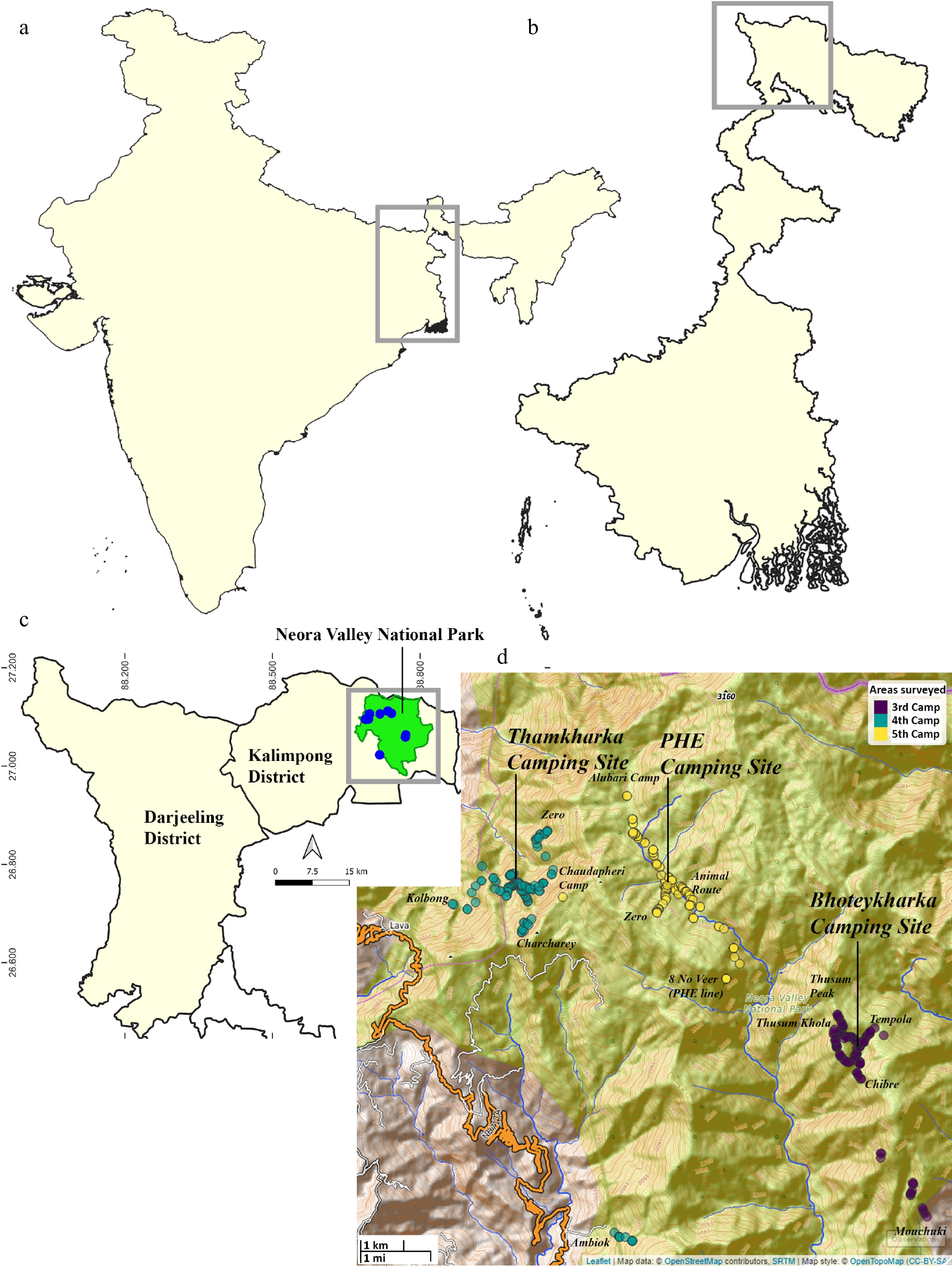 (a) Map of India showing location of the state of West Bengal (in grey box). (b) Map of West Bengal showing location of Darjeeling and Kalimpong districts (in grey box). (c) Map of Kalimpong district with location of Neora Valley National Park (in green polygon), survey locations (blue dots) in Kalimpong District and area focused for figure d (in grey box). (d) Survey locations covered during 3rd (Purple dots), 4th (Aquamarine dots), and 5th (Yellow dots) ABACs. Maps (a−c) were prepared using QGIS (v. 3.26) and (d) using the mapview package in R (v. 4.2.1).
