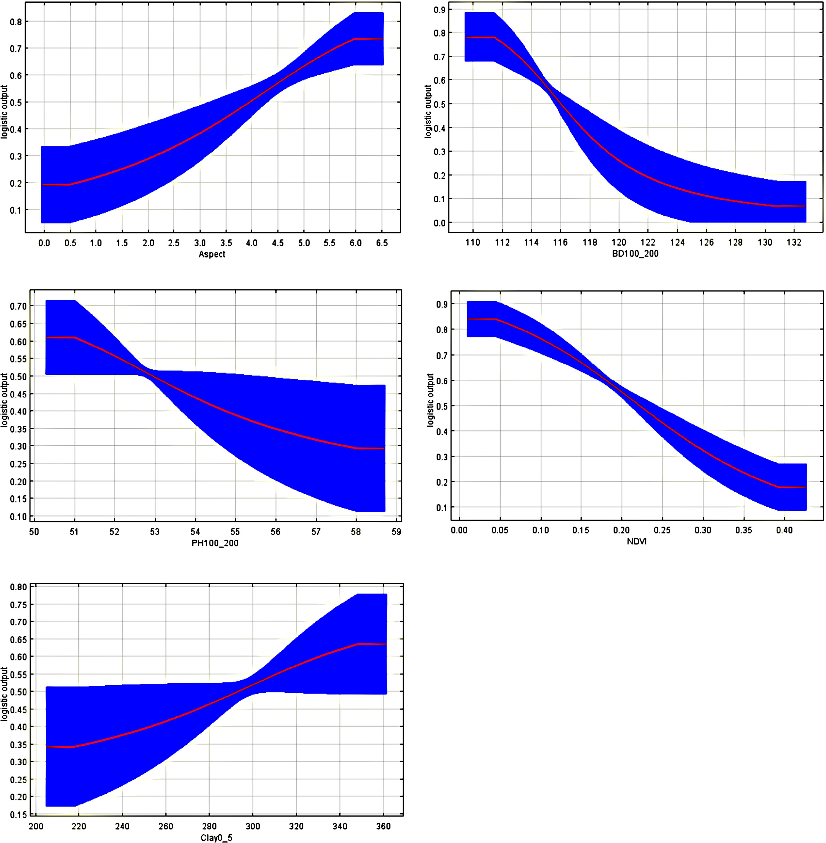 The curves show the mean response of the 10,000 replicate MaxEnt runs (red), and the mean +/− one standard deviation (blue).