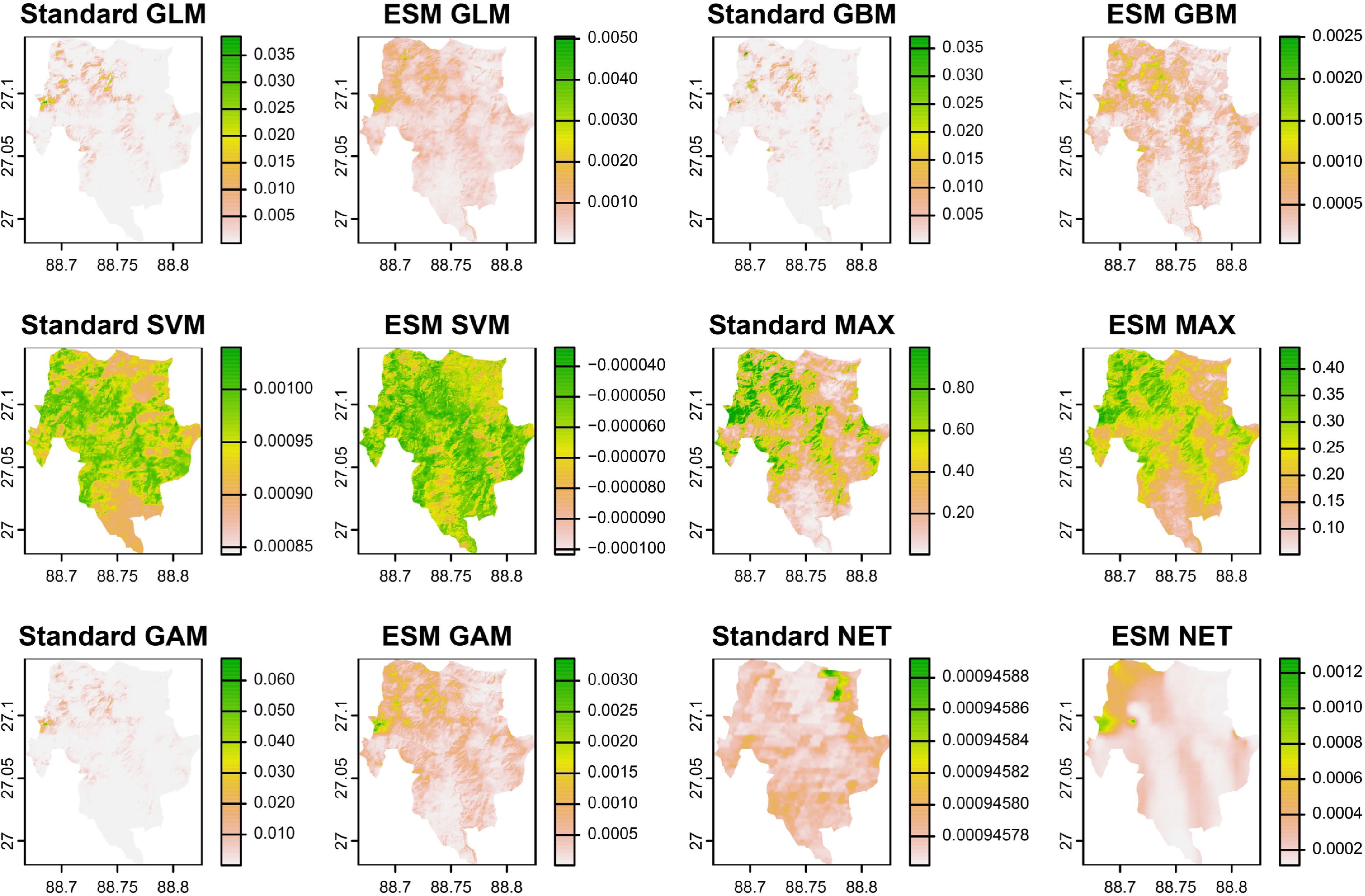 • This study utilized the Ensemble of Small Models (ESM) approach, a robust methodology applied to various species distribution models (SDMs), including Generalized Linear Models (GLM), Generalized Boosted Models (GBM), Support Vector Machines (SVM), MaxEnt, Generalized Additive Models (GAM), and Neural Networks (NET). By employing both standard and ESM versions of these SDMs, we generated predictive models for the distribution of Myxomycetes within Neora Valley National Park (NVNP). The outcomes of these models are presented in Fig. 4. To identify the most optimal model, we prioritized those exhibiting the highest mean Area Under the Curve (AUC) and True Skill Statistic (TSS) values, following established model performance criteria[42].