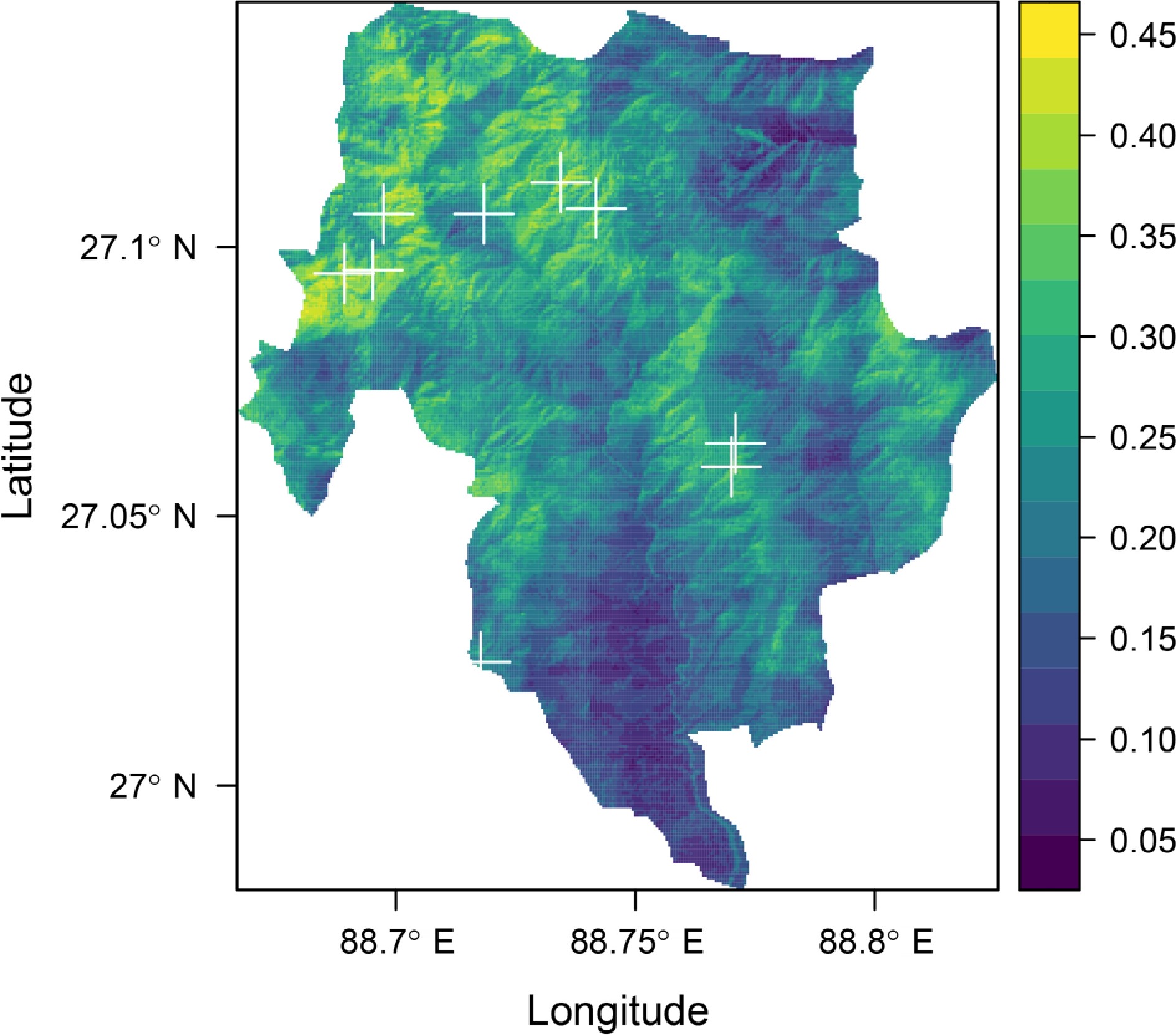 The selected 27.83 m grid captured essential meso-scale drivers of Myxomycete distribution, including canopy height variation, topographic complexity, and vegetation productivity, which act as proxies for micro-scale factors such as moisture availability and substrate decomposition. Although individual microhabitats remain below the resolution of the environmental layers, their effects were implicitly integrated through these broader gradients. This modelling approach provided a robust baseline for NVNP, where no previous spatial modeling of Myxomycetes has been conducted. It also offered substantially greater spatial detail than earlier MaxEnt models for the group, viz. 2.5 arc m (4.630 km2 at the equator)[34] and 30 arc s (0.926 km2 at the equator)[35,36]. Consequently, the habitat suitability maps generated here represent potential distributions rather than precise microhabitat occurrences, providing an ecologically coherent interpretation of how micro-scale ecological processes are nested within broader environmental gradients across the NVNP landscape[37].