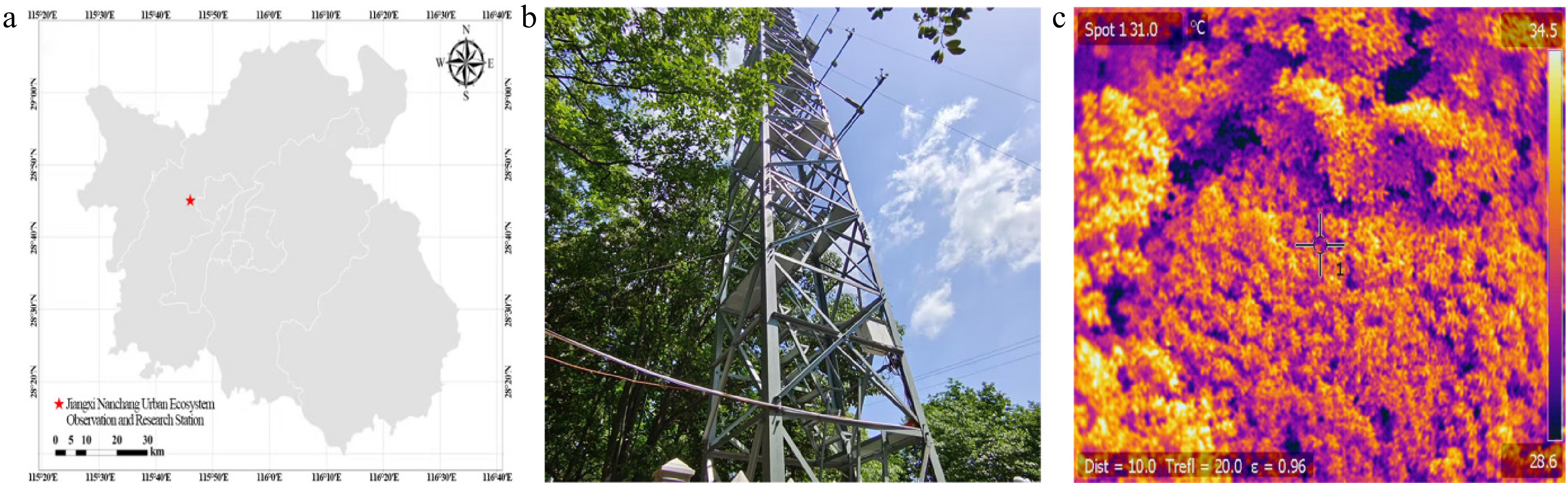 The location of (a) the research site, (b) the illustration of flux tower, and (c) the thermal infrared imagery collected from the urban forest ecosystem.