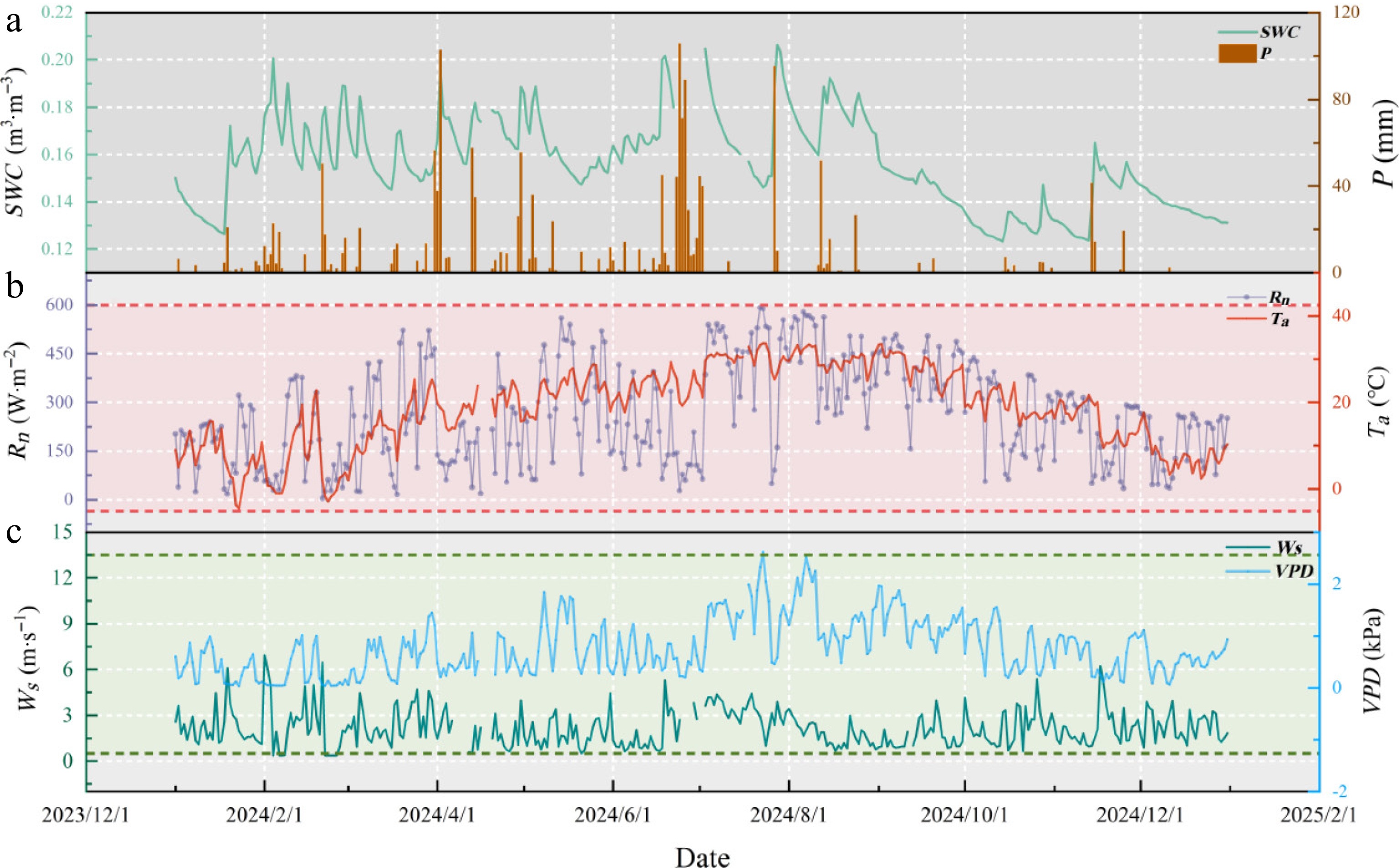 Seasonal dynamics in (a) soil water content (SWC) and precipitation (P), (b) air temperature (Ta) and net radiation (Rn), (c) wind speed (Ws) and vapor pressure deficit (VPD) in the Nanchang urban forest ecosystem.