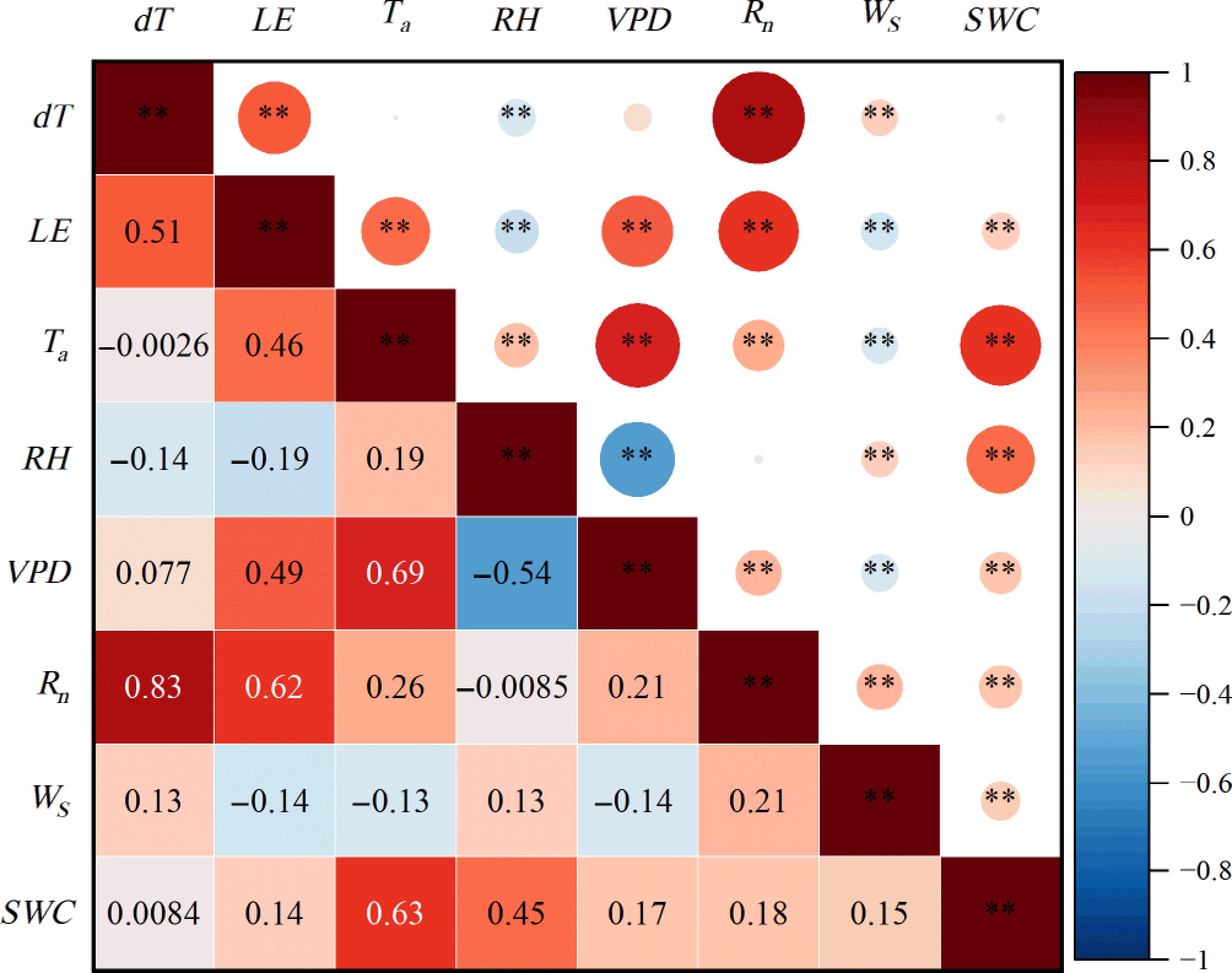 • The dT in the Nanchang urban forest ecosystem was strongly influenced by environmental factors. Except for Ta, VPD, and SWC, all remaining variables were significantly correlated with the dT (p < 0.01). Rn was the dominant control factor, with a Pearson correlation coefficient (r) of 0.83, markedly higher than those of the other factors. RH and Ws followed, with coefficients of 0.14 and 0.13, respectively. In addition, LE and dT showed a significant positive correlation (r = 0.51, p < 0.01); with increasing heat dissipation, the dT of the urban forest ecosystem increased (Fig. 3).