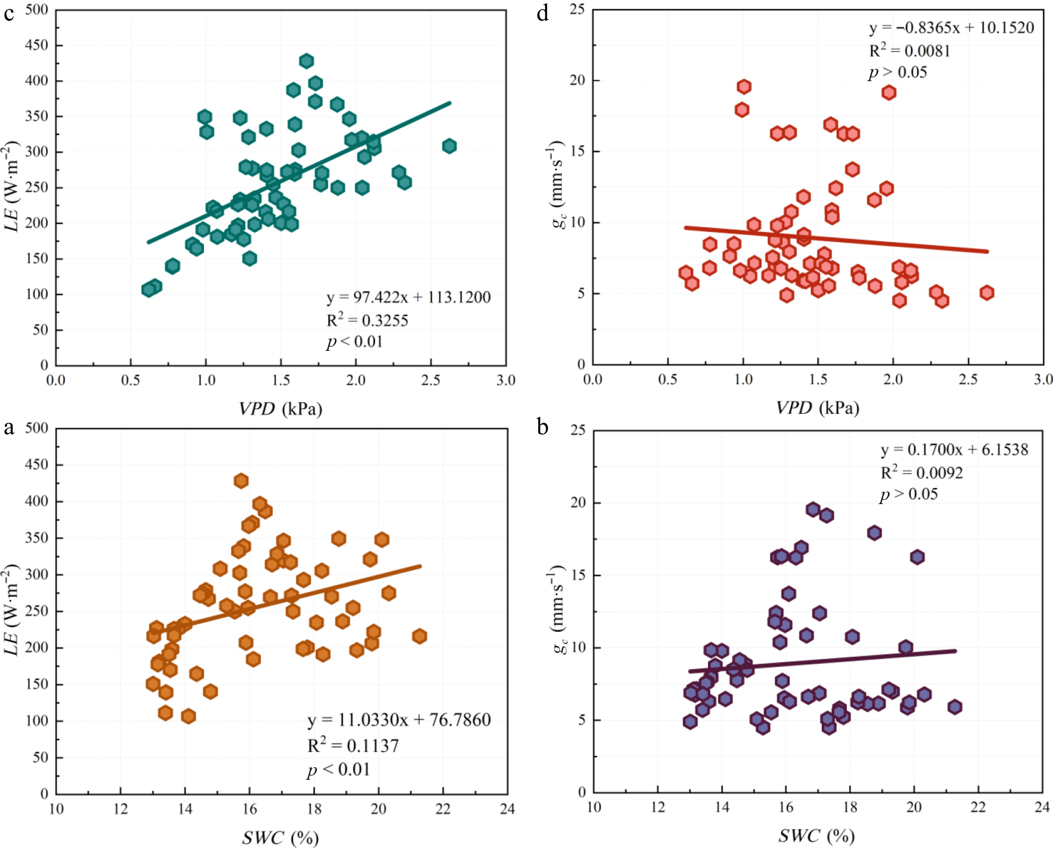 • During the study period, LE and gc in the Nanchang urban forest ecosystem ranged from 100–450 W·m−2 and 4–20 mm·s−1, respectively (Fig. 4). LE increased significantly with SWC (p < 0.01), yet SWC explained only 11% of the variance in LE. In contrast, LE did not exhibit a declining trend under elevated VPD; instead, a positive correlation was observed between the two variables. Although gc tended to increase with higher SWC and lower VPD, neither SWC nor VPD was significantly correlated with gc (p > 0.05) (Fig. 4). These results indicate that traditional water-status indicators fail to track variations in gc or LE in humid-region urban forests and are insensitive to early drought events.