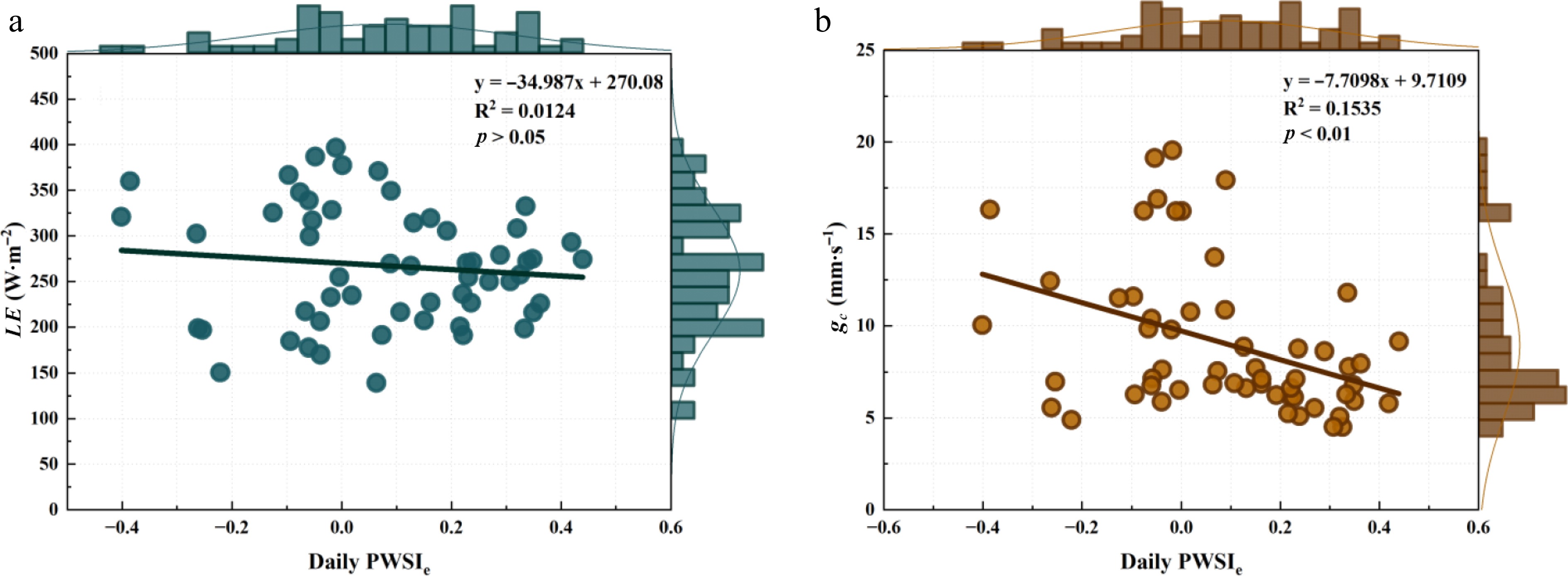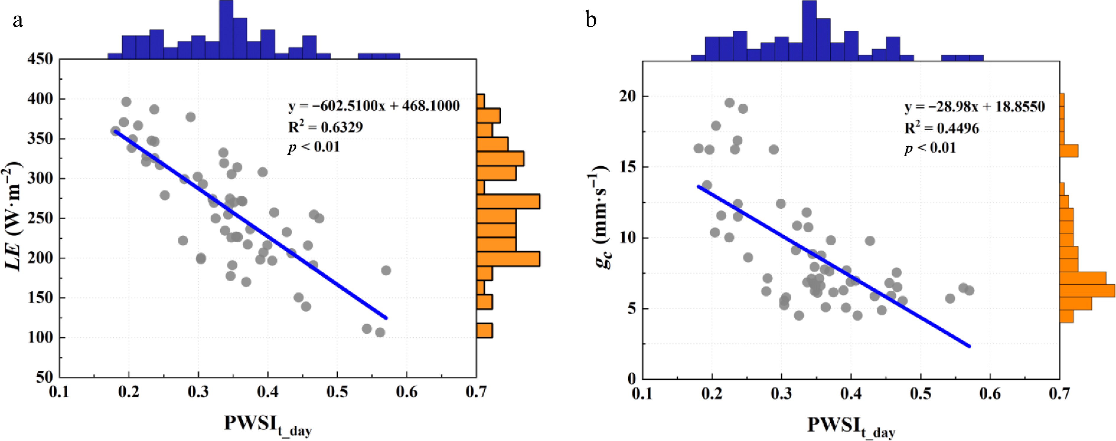 • During the study period, the daytime mean PWSIt (PWSIt_day) from 08:00 to 17:00 derived by the theoretical method ranged between 0.15 and 0.60. As PWSIt_day increased, gc and LE declined progressively (p < 0.01) (Fig. 7). PWSIt_day explained 45% and 64% of the observed variations in gc and LE, respectively (Fig. 8). These results demonstrate that the theoretically derived PWSIt provides a robust means of tracking water-status changes in humid-region urban forests and enables early detection of ecosystem drought events.