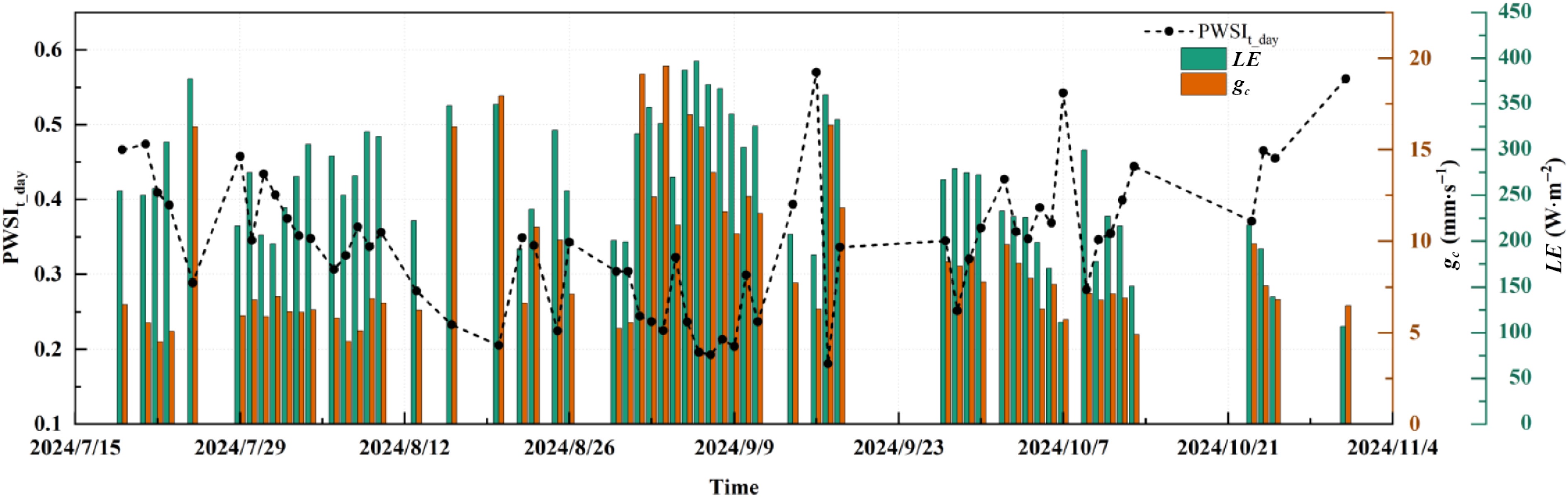 Daily variations in the daytime mean theoretical plant water stress index (PWSIt_day), canopy conductance (gc), and latent heat flux (LE) on sunny days from July to October 2024. ** represents p < 0.01; * represents p < 0.05.