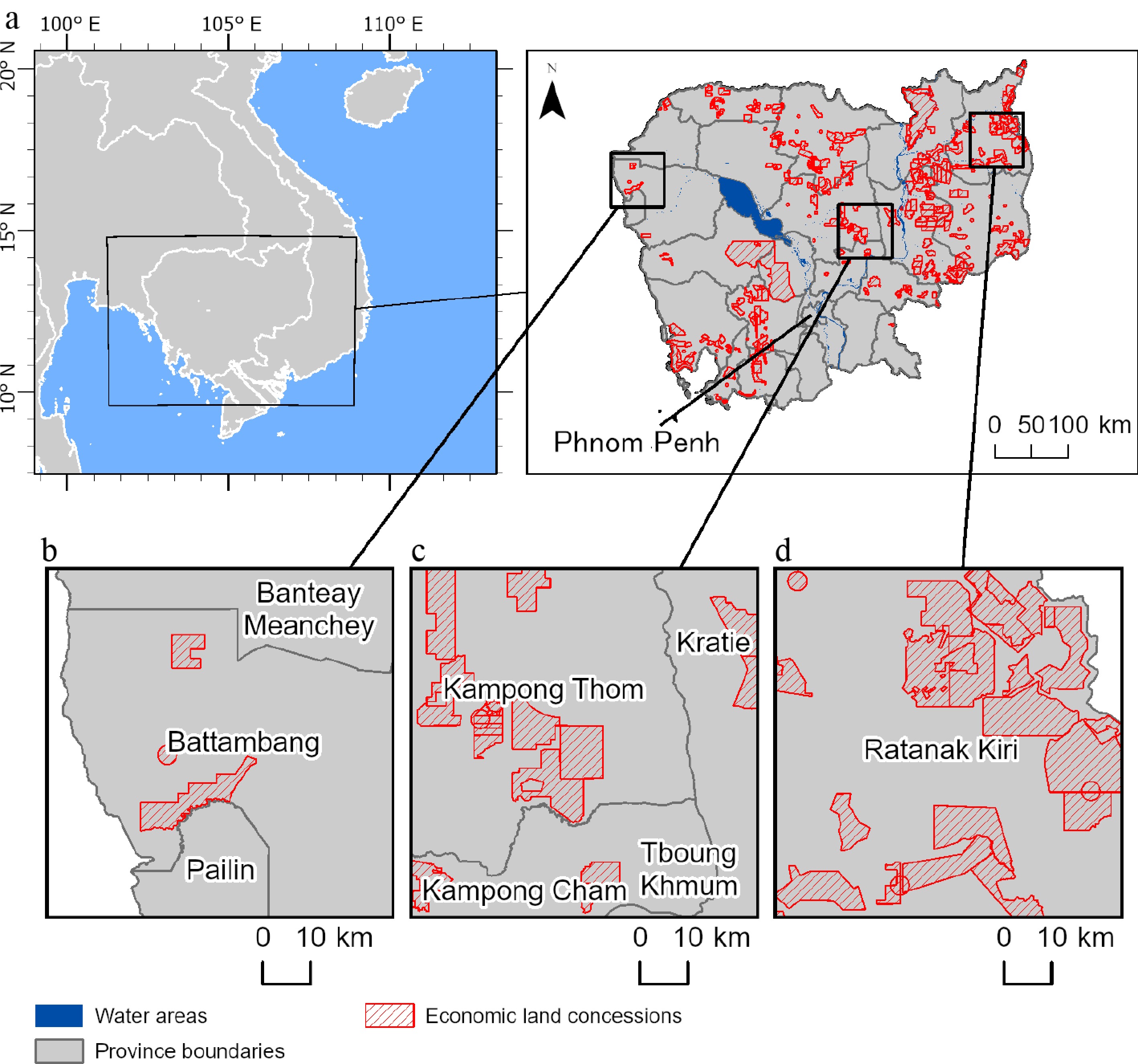 Study area showing provincial boundaries, water areas, and distribution of Economic Land Concessions (ELCs).