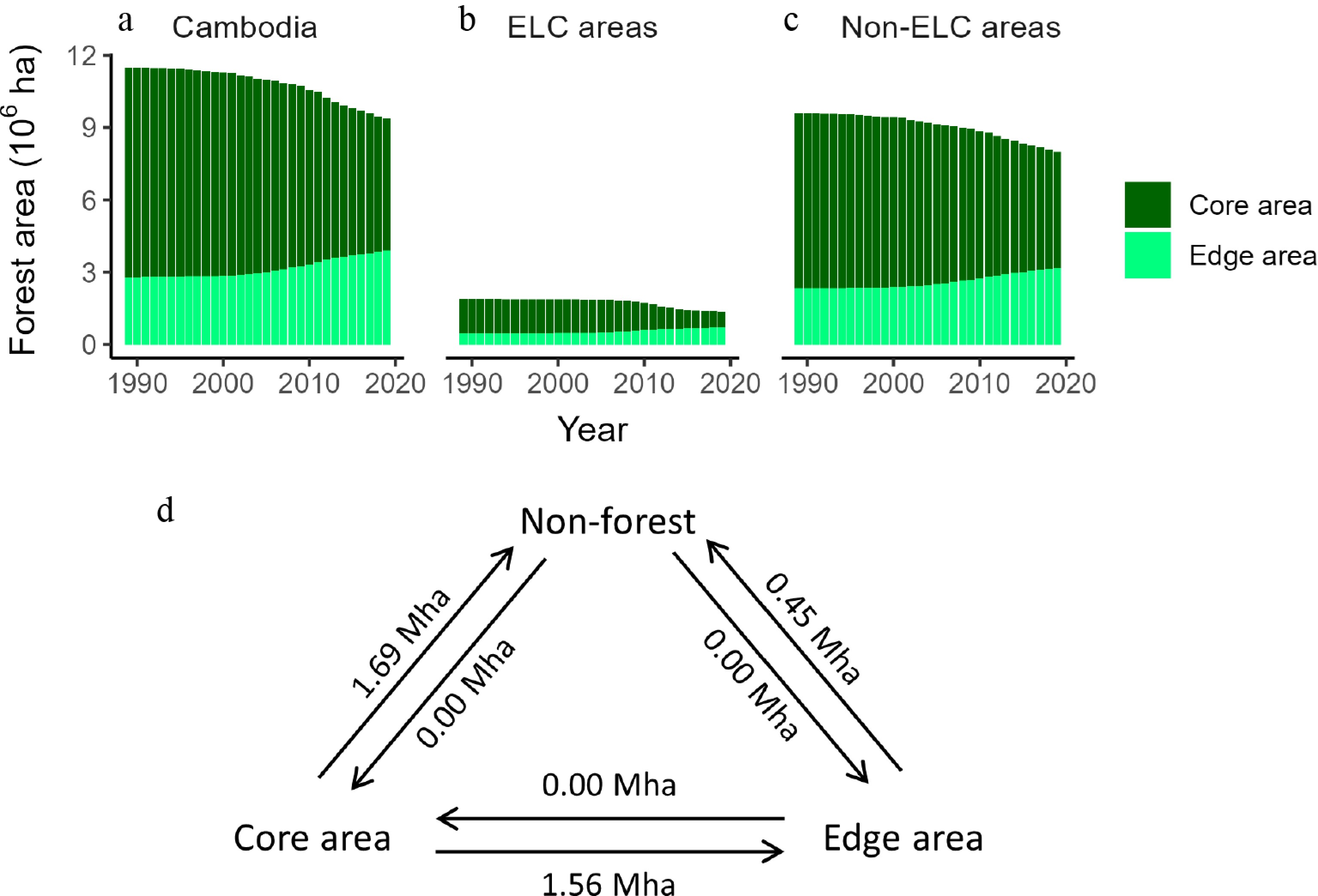 Annual changes in forest cover and transitions from 1989 to 2019. (a) Forest cover trends for Cambodia; (b) forest cover trends inside ELC areas; (c) forest cover trends outside ELC areas; (d) area transitions among core forest, edge forest, and non-forest for Cambodia as a whole.