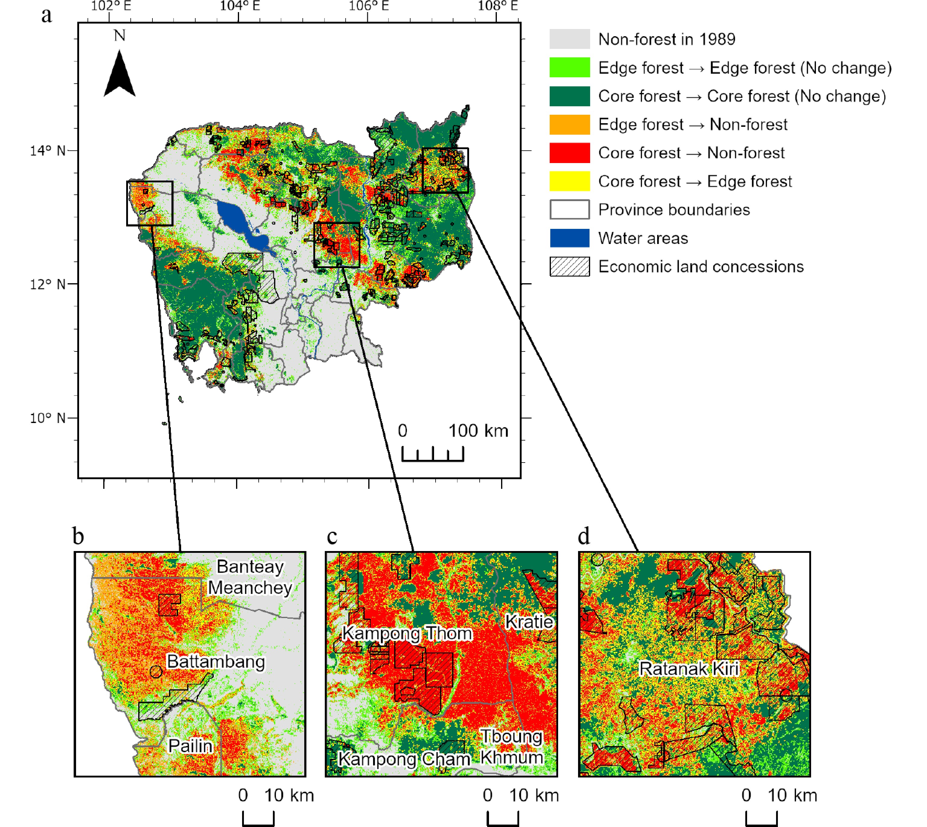 Spatial patterns of forest status transitions (1989–2019) across Cambodia. (a) Forest cover changes across the entire country. (b) Changes in forest cover in the western region of Cambodia, near the Thai border in Battambang and Pailin Provinces. (c) Changes in forest cover in the central region of Cambodia, around Kampong Thom Province. (d) Changes in forest cover in the northeastern region of Cambodia, around Ratanakiri Province.