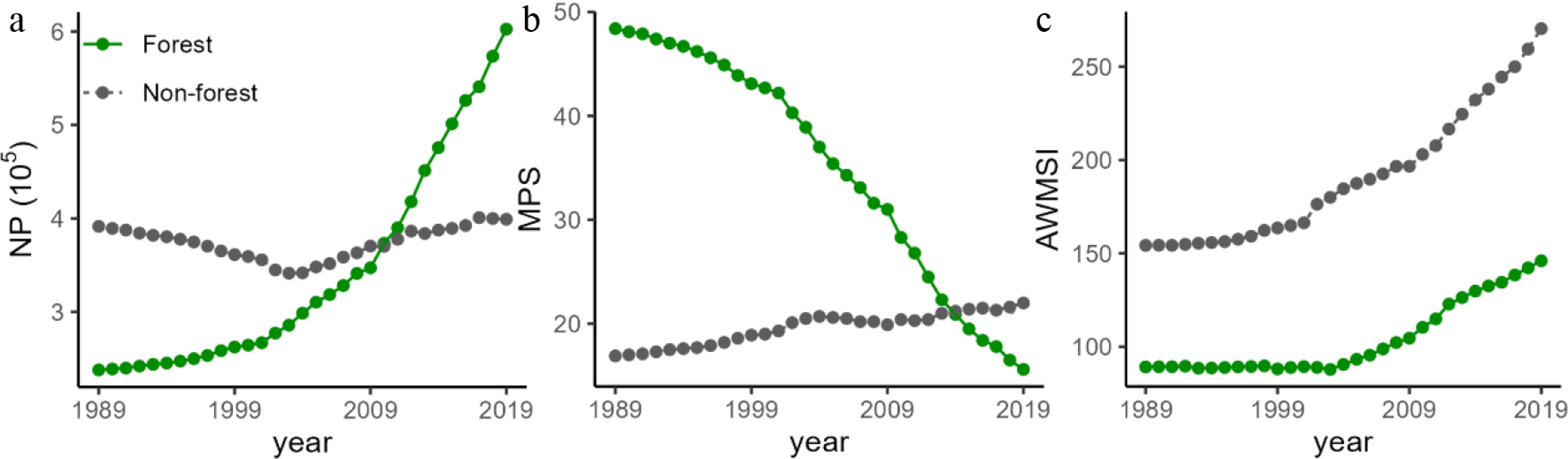 Temporal trends in forest landscape metrics from 1989 to 2019. (a) Number of patches (NP), (b) mean patch size (MPS), (c) area-weighted mean shape index (AWMSI).