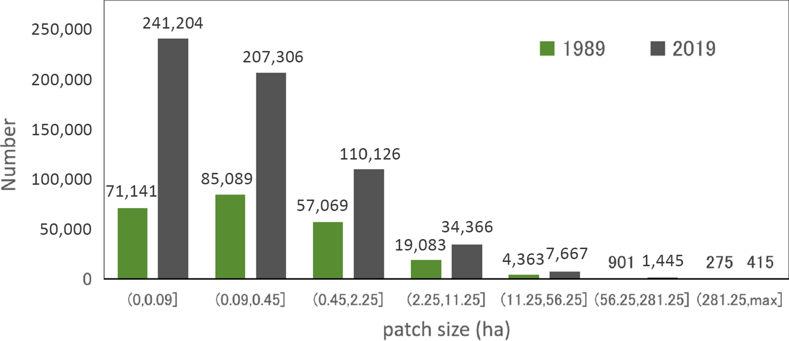 Distribution of patch numbers across size intervals in 1989 and 2019.