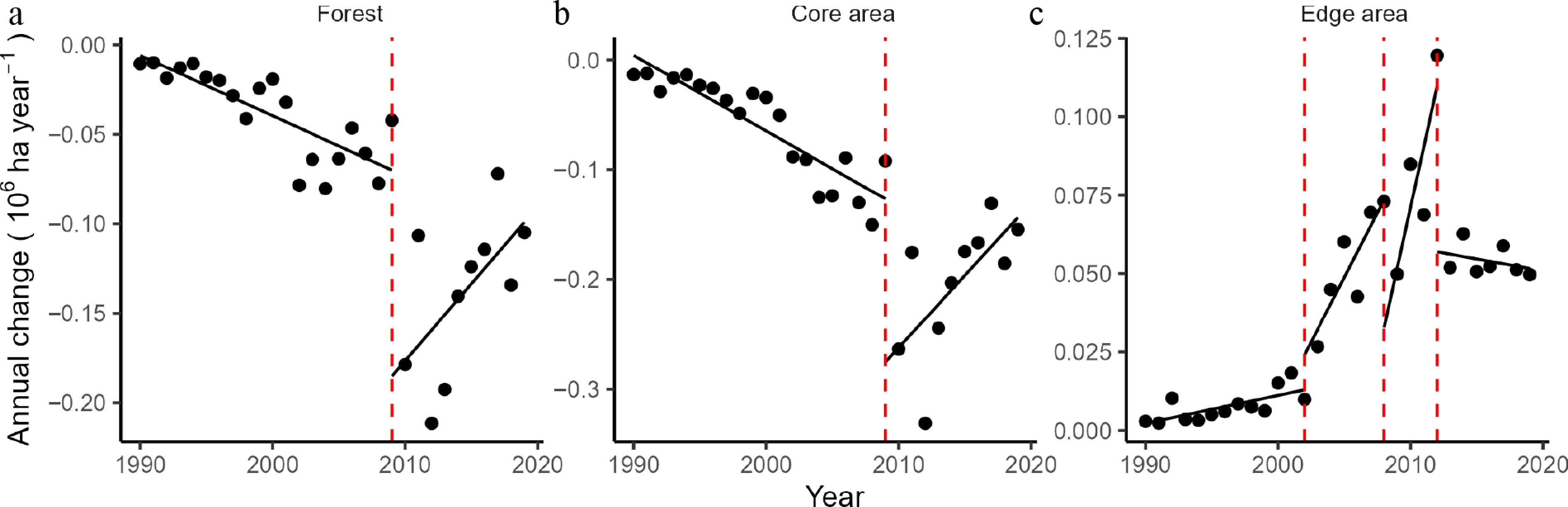 Annual forest cover changes from 1989 to 2019. (a) Forest area, (b) forest core area, (c) forest edge area. Vertical dashed red lines indicate the detected break years: 2009 for forest area and core forest area, and 2002, 2008, and 2012 for edge forest area.