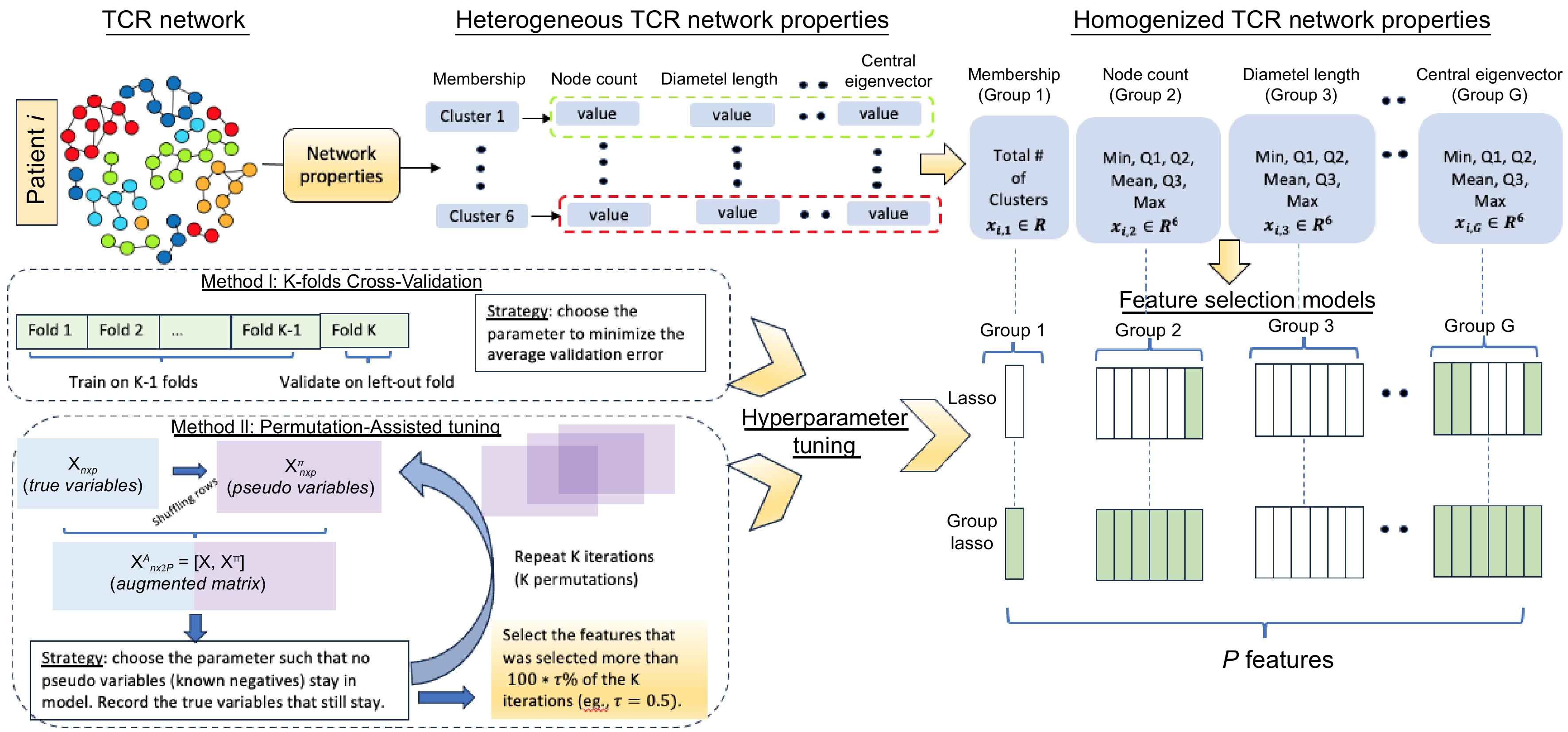 (TCRs)[1,2] are a group of protein complexes on the surface of T-cells. TCRs recognize and bind to specific antigen peptides[3] found on abnormal cells or potentially harmful pathogens. Once the TCRs bind to the pathogens, the T-cells attack these cells and help the body fight infection, cancer, or other diseases. TCR repertoires, which are continually shaped throughout the lifetime of an individual in response to pathogenic exposure, can serve as a fingerprint of an individual's current immunological profile. The protein structures of TCRs determine the binding between TCRs and antigen peptides[4]. Thus, the similarity among TCR sequences directly influences the antigen peptide recognition breadth. Network analysis, where TCR clones are represented by vertices and connected if similar in sequences (distance is less than a particular number) by using some sequence similarity measures (e.g., Hamming distance, Levenshtein distance[5], etc.), was used as a novel perspective to study TCR clusters and their binding to antigen peptides. As the binding patterns will eventually impact the high-level responses, the aim is to use network structure as a special layer of information to investigate its potential connection to clinical outcome or disease status, as evidenced in existing literature[6]. For example, it was observed that lung cancer patients with focused TCR repertoires and complex network connections attained significantly longer overall survival (OS) than those with smaller clusters[7]. Therefore, quantitative analysis of the TCR repertoire network properties has the potential to provide a better understanding of the immune landscape involving T cell responses. However, network properties are highly heterogeneous, as they can be measured at node and cluster levels, and networks differ in the number of nodes and clusters. Thus, it is challenging to perform statistical inference or machine learning directly on the TCR network properties to study their relationship with clinical outcomes.A flexible and efficient approach was proposed to prioritize TCR Network Properties (TCR-NP) by leveraging extracted features from the heterogeneous network properties to assess their relationship with the outcome of interest, while incorporating the group structure based on the nature of the features. As an initial investigation, we propose extracting simple summary statistics (e.g., min, Q1, mean, median, Q3, max) from the network property values since they can be easily calculated and carry the key signatures of a distribution. Since the extracted features are naturally grouped by network property, TCR-NP is constructed on the Group Lasso model[8], a classical statistical method that offers several advantages in feature selection and prioritization. Specifically, it promotes group-level selection and addresses multicollinearity issues by selecting or excluding the entire groups (network properties), which is particularly beneficial when dealing with highly correlated variables (often found within the same network property). Moreover, it can handle the high-dimensional data (small sample, a large number of features commonly seen in TCR network data) efficiently (via L1 regularization[9]), resulting in a sparse solution that will facilitate the subsequent interpretations. Additionally, it can be applied to different response types (e.g., categorial, quantitative, and time-to-event), which will fulfill the needs of different application scenarios.