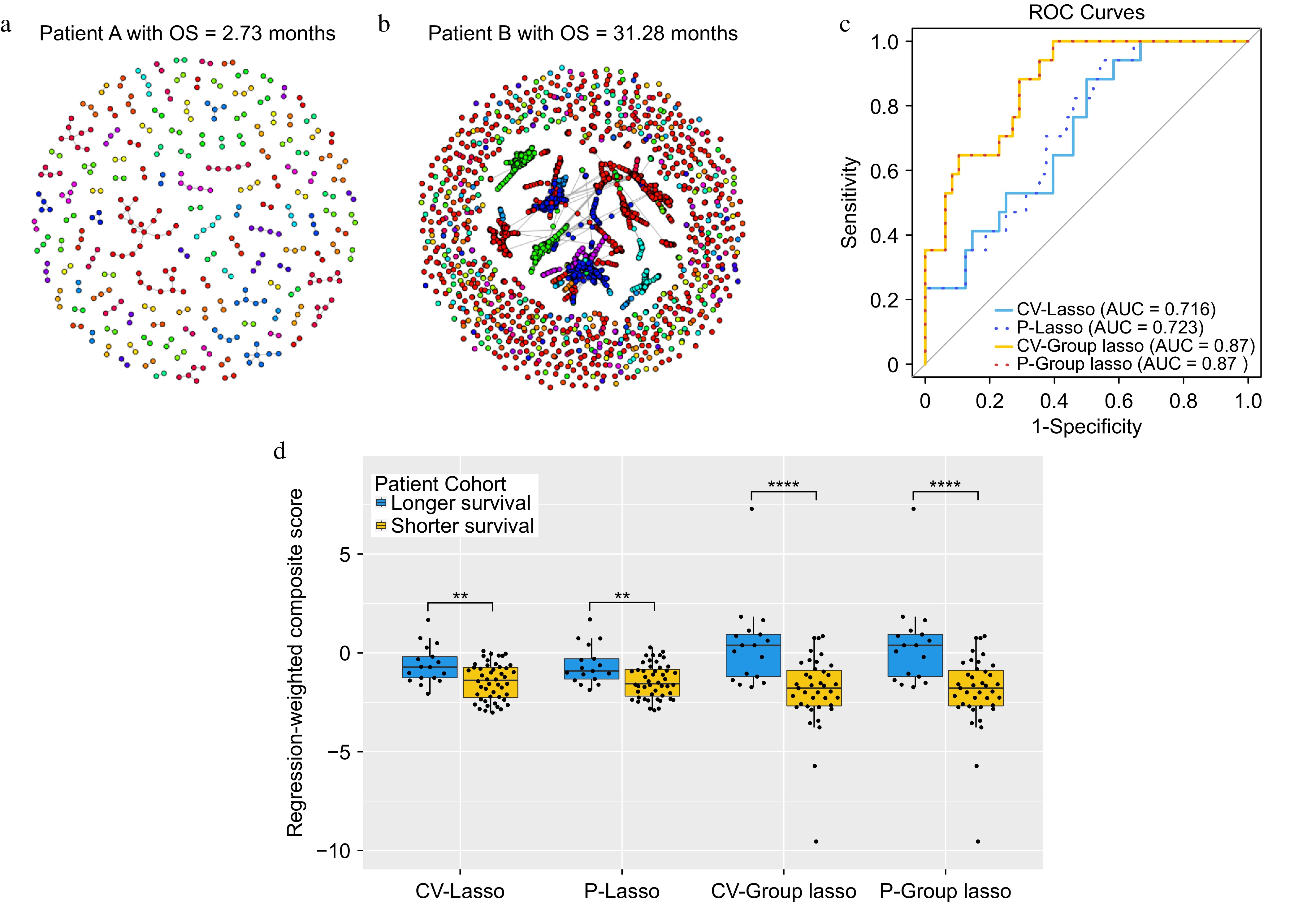 TCR repertoire network analysis was conducted for each of 65 lung cancer patients[7]. Figure 2a and b illustrate the network for two representative patients. The number of TCR clusters in each patient ranged from 15 to 883 per patient with a median of 271. Eleven network properties for each TCR cluster were evaluated (Table 1) and 70 network property features derived (Supplementary Table S2) by obtaining summary statistics of each network property for each patient (Fig. 1 & Table 2). The summary statistics consist of descriptive information like minimum, 1st quartile, median, mean, 3rd quartile, and maximum values and the proportion of NA if it exists. The existence of NA values is due to not being able to evaluate for a particular cluster structure. For example, assortativity, transitivity, central Eigen, and central closeness are all NA when there are two nodes in one cluster (Supplementary Fig. S1). All extracted features are then standardized, following common practice. CV-Lasso, P-Lasso, CV-Group Lasso, and P-Group Lasso models were then applied with the corresponding parameters listed in Supplementary Table S1. The significant network property features identified by the P-Lasso model were a subset of those from the CV-Lasso model, aligning with the known tendency of permutation-assisted tuning to reduce false positives (Table 4). The consistency between P-Group Lasso and CV-Group Lasso results, including identical prediction outcomes (AUCs), strengthen findings (Fig. 2c). Both models selected all features from the most significant network properties, resulting in a higher AUC (0.87) than CV-Lasso and P-Lasso (Fig. 2c). Furthermore, composite scores were calculated using the linear combination of the model coefficients times the corresponding selected features in the logistic regression model. The weighted composite scores were compared between longer and shorter survival (overall survival greater than or less than the median overall survival, respectively) by two-sample t-test. It was found that the differences in scores between longer and shorter survival groups (overall survival above or below median) were more significant in the CV-Group Lasso and the P-Group Lasso (p-value < 0.0001) compared to CV-Lasso and P-Lasso (Fig. 2d).