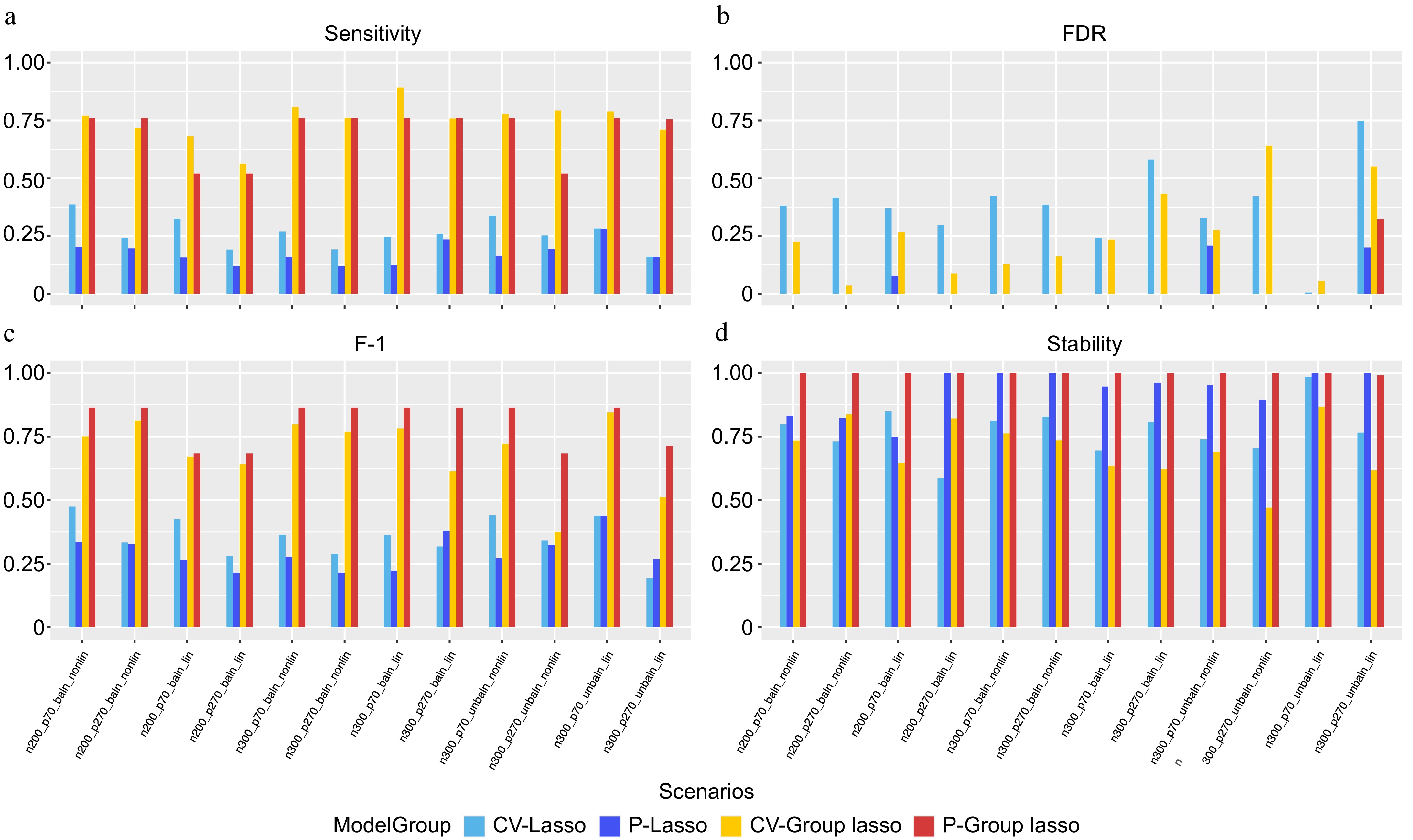 An extensive simulation study was conducted to assess the performance of the four models, using the parameters outlined in Supplementary Table S1. The simulation scenarios are detailed in Table 3, with additional parameters provided in Supplementary Fig. S2. The observations indicate that Group Lasso models consistently exhibit higher sensitivity in identifying causal variables compared to Lasso models, with CV slightly outperforming permutation-assisted parameter tuning regardless of the Lasso or Group Lasso approach (Fig. 3a). Notably, permutation-assisted parameter tuning demonstrates superior FDR results for both Lasso and Group Lasso models (Fig. 3b). Specifically, the P-Group Lasso model shows improved performance across F1 scores (Fig. 3c) and stability (Fig. 3d) in all scenarios compared to CV-Group Lasso, with a notably lower FDR. Conversely, P-Lasso and CV-Lasso models exhibit poorer performance across all metrics compared to P-Group Lasso and CV-Group Lasso, except for FDR, where results vary by scenario. Interestingly, P-Lasso and P-Group Lasso models demonstrate the ability to extract causal features without any false positives in certain scenarios, aligning with the lower false positive rates associated with permutation-assisted tuning. Furthermore, increased model stability was observed with P-Lasso and P-Group Lasso, a critical feature in biomedical settings. While CV-Lasso and P-Lasso models extract top network property features regardless of underlying grouping structures, CV-Group Lasso and P-Group Lasso models consistently identify top network properties across all grouped variables. Overall, the models exhibit robustness across various simulation scenarios, including sample size, number of features, balance of outcome interest, and linear vs nonlinear relationships among causal variables.