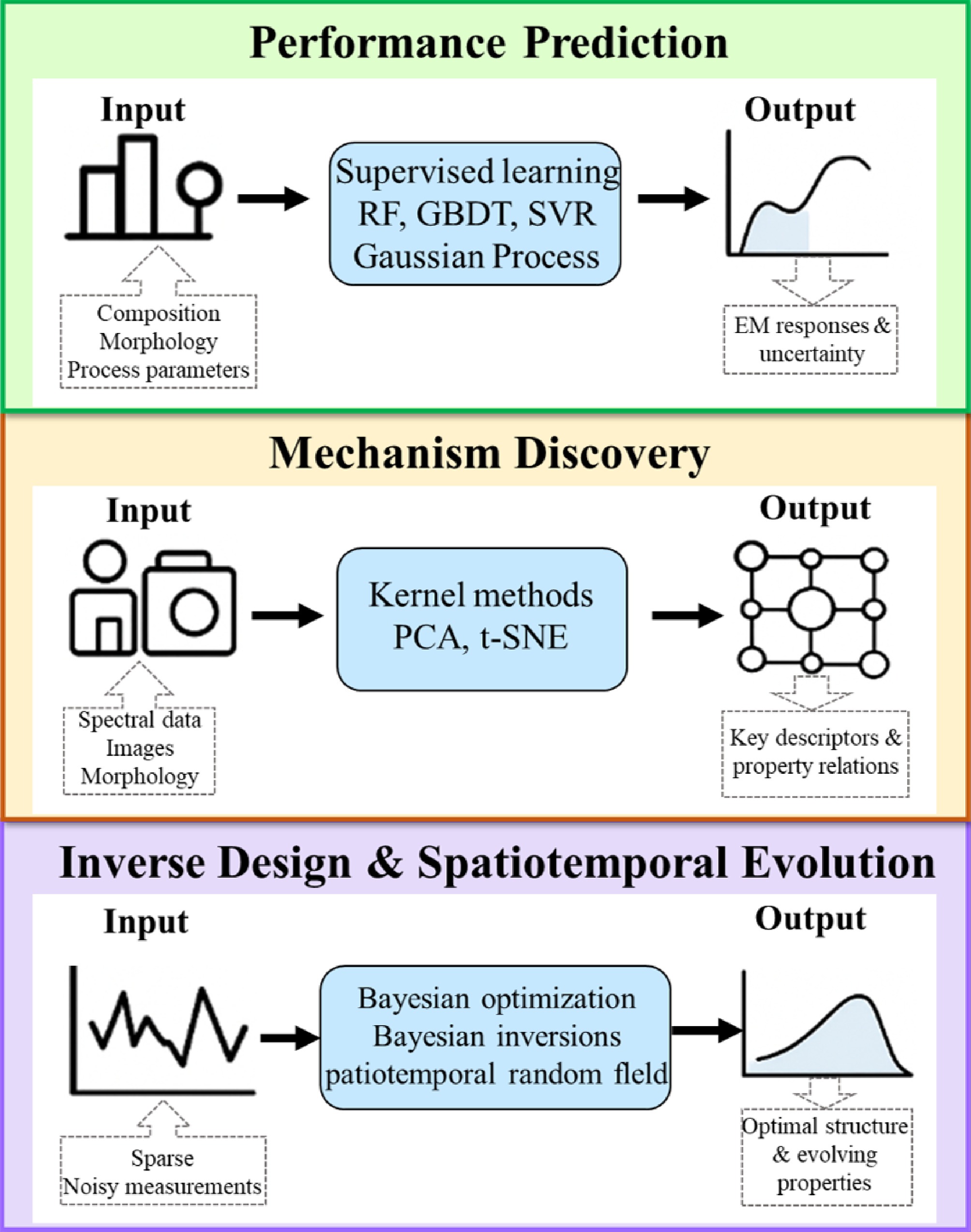 In recent years, statistical methodologies—have also been referred to as data-driven design approaches[6]. In the context of this review, statistical methodologies are defined as an overarching framework encompassing classical statistical tools (e.g., regression analysis, variance testing), statistical modeling paradigms (e.g., Bayesian inference, nonparametric kernel methods), and modern machine learning and deep learning algorithms. Machine learning is here regarded as a subset of statistical methodologies, with algorithms such as random forests[7,8], support vector machines, Gaussian process regression[9], and gradient boosting trees[10] widely applied to materials research. More recently, deep learning architectures including convolutional neural networks (CNN), residual networks (ResNet), and generative adversarial networks (GAN) have been introduced for tasks such as property prediction, structure optimization, and rapid inverse design of metamaterials, thereby extending the predictive and design capabilities of data-driven frameworks. These statistical models now enable comprehensive research capabilities spanning material performance prediction, structural optimization, mechanism identification, parameter inversion, and efficient simulation. For electromagnetic functional materials specifically, statistical methodologies have not only substantially enhanced the efficiency of material design and performance modulation but have also created new pathways for deciphering complex physical mechanisms and establishing structure–performance–function relationships[11,12].