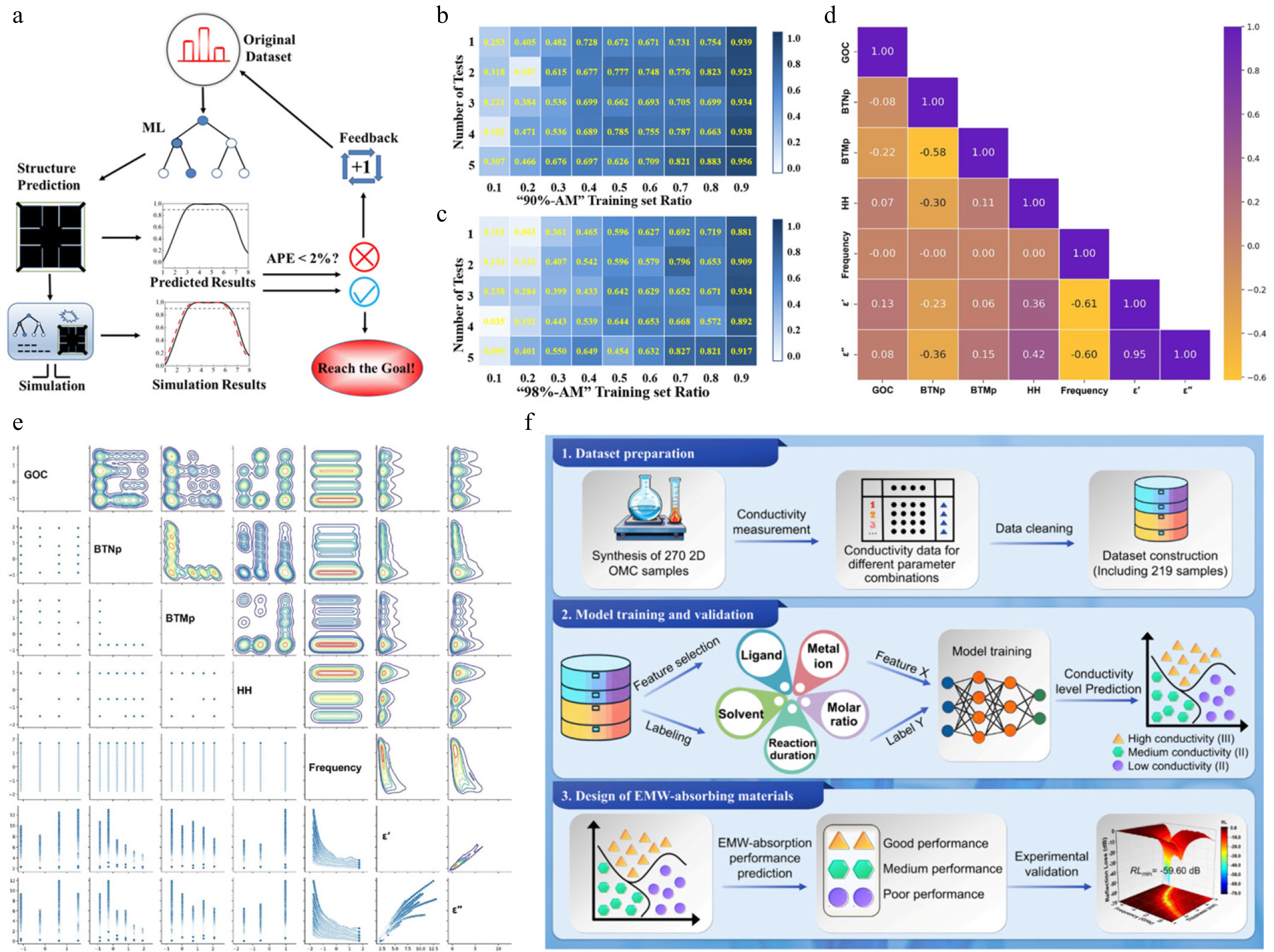 (a) Schematic illustration of the machine learning–assisted prediction workflow for optimizing metasurface structural parameters. (b), (c) Coefficients of determination (R2) under varying training set proportions[11]. (d) Heat map of Pearson correlation coefficients between input features and output variables. (e) Correlation matrix of input features with dielectric properties, visualized through scatterplots. Diagonals show feature distributions[55]. (f) Machine learning strategy for conductivity prediction and electromagnetic wave absorber design in 2D ordered mesoporous carbons (OMCs)[12].