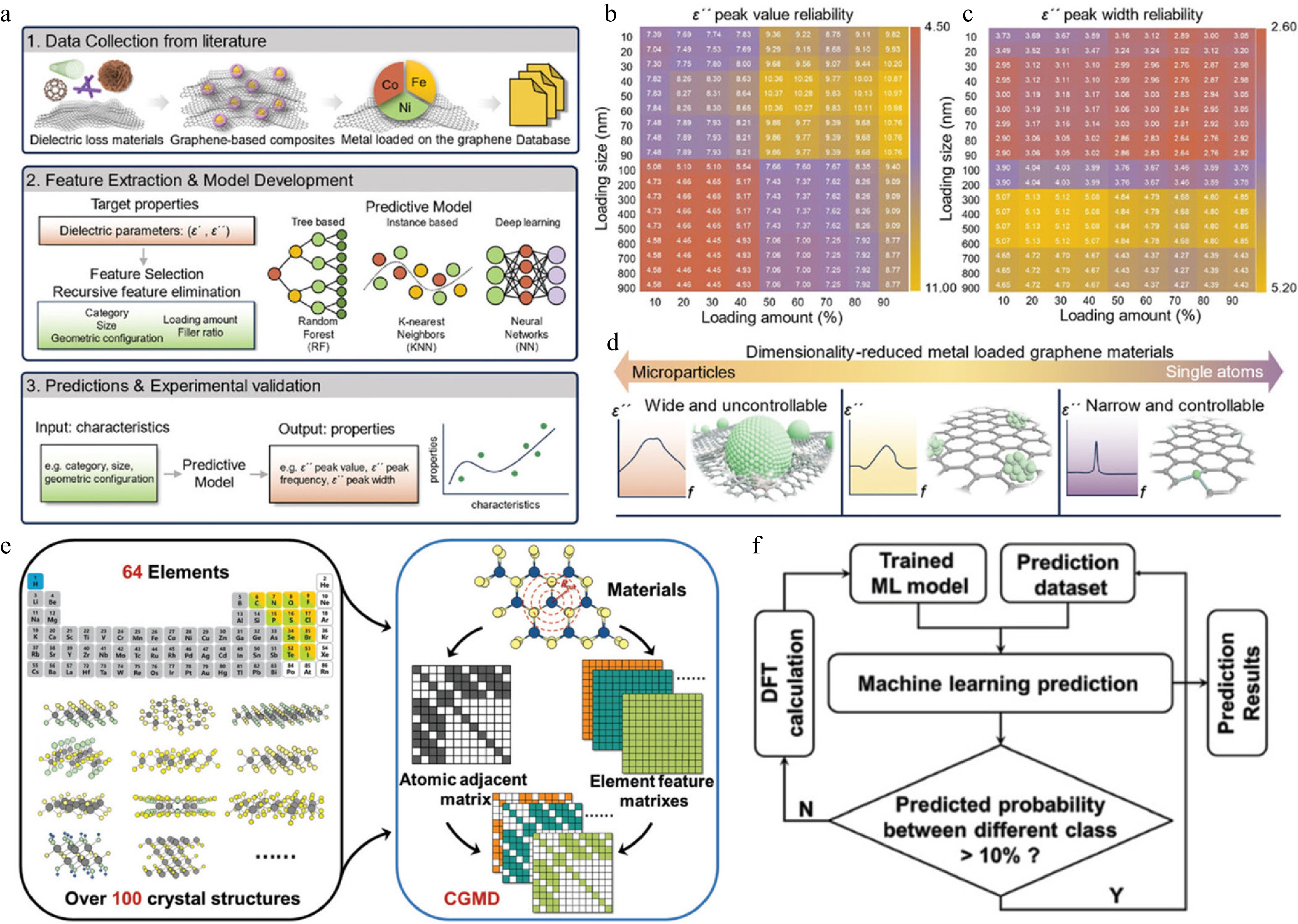 (a) Workflow for predicting the relationship between material descriptors and dielectric loss parameters. (b) Reliability of ε peak values for Co/graphene composites at 50% loading. (c) Reliability of peak widths under the same condition. (d) Influence of metal loading size on dielectric loss parameters in graphene-based materials[5]. (e) Schematic of the Crystal Graph Multilayer Descriptor (CGMD) computation. (f) Iterative machine learning feedback loop for active materials discovery[61].