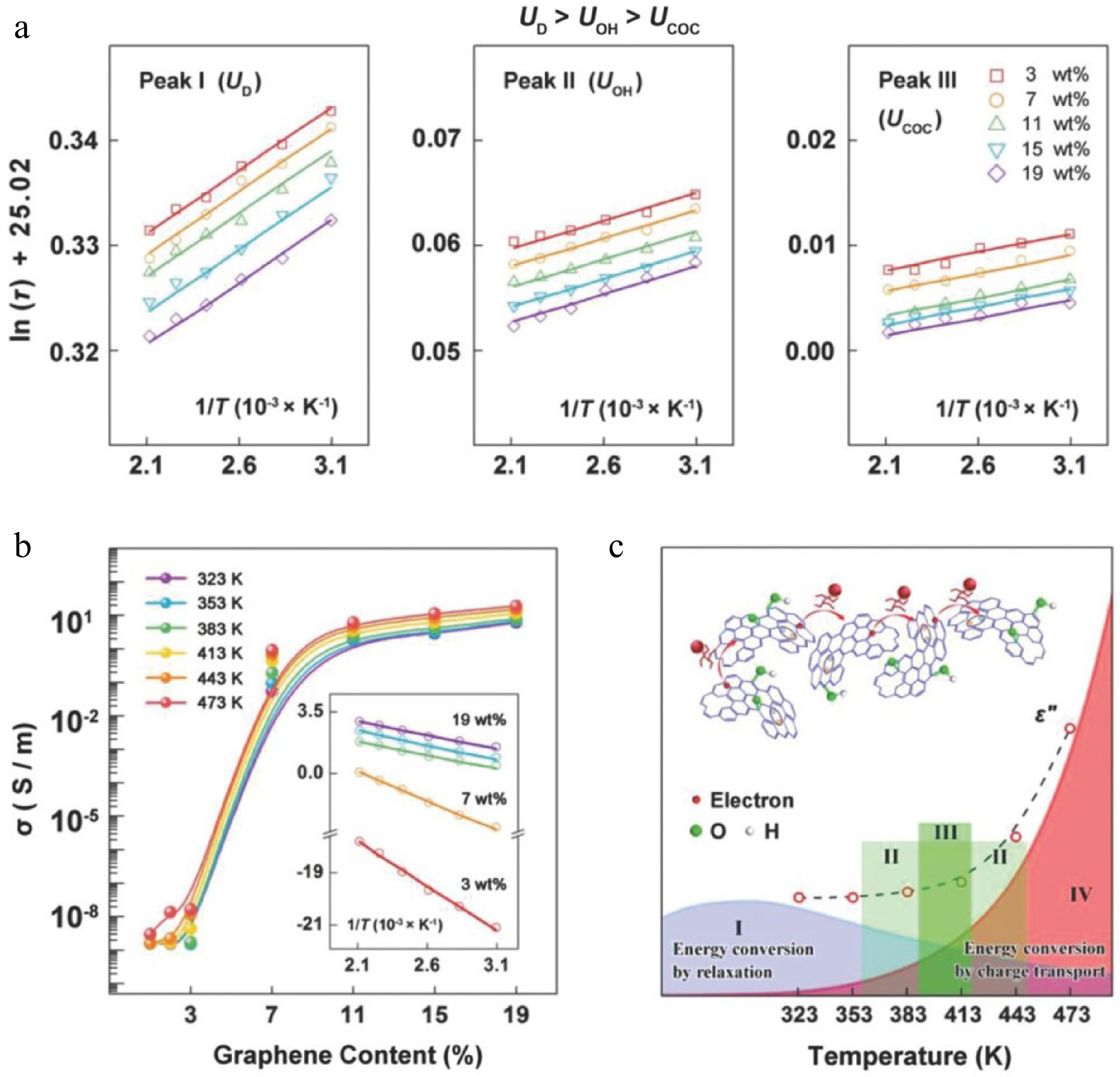 (a) Arrhenius plots of ln(τ) vs inverse temperature (T−1) for relaxation peaks of different defect-induced dipoles. (b) Conductivity (σ) as a function of graphene content from 323 to 473 K (inset: ln(σ) vs T−1, where the charge transport barrier is proportional to the absolute slope). (c) Temperature dependence of polarization relaxation loss (εp″), and charge transport loss (εc"), with regions I−IV indicating: I—dominance of εp"; II—synergistic and competitive interaction between εp″ and εc″; III—equilibrium between εp" and εc"; IV—dominance of εc"[64].