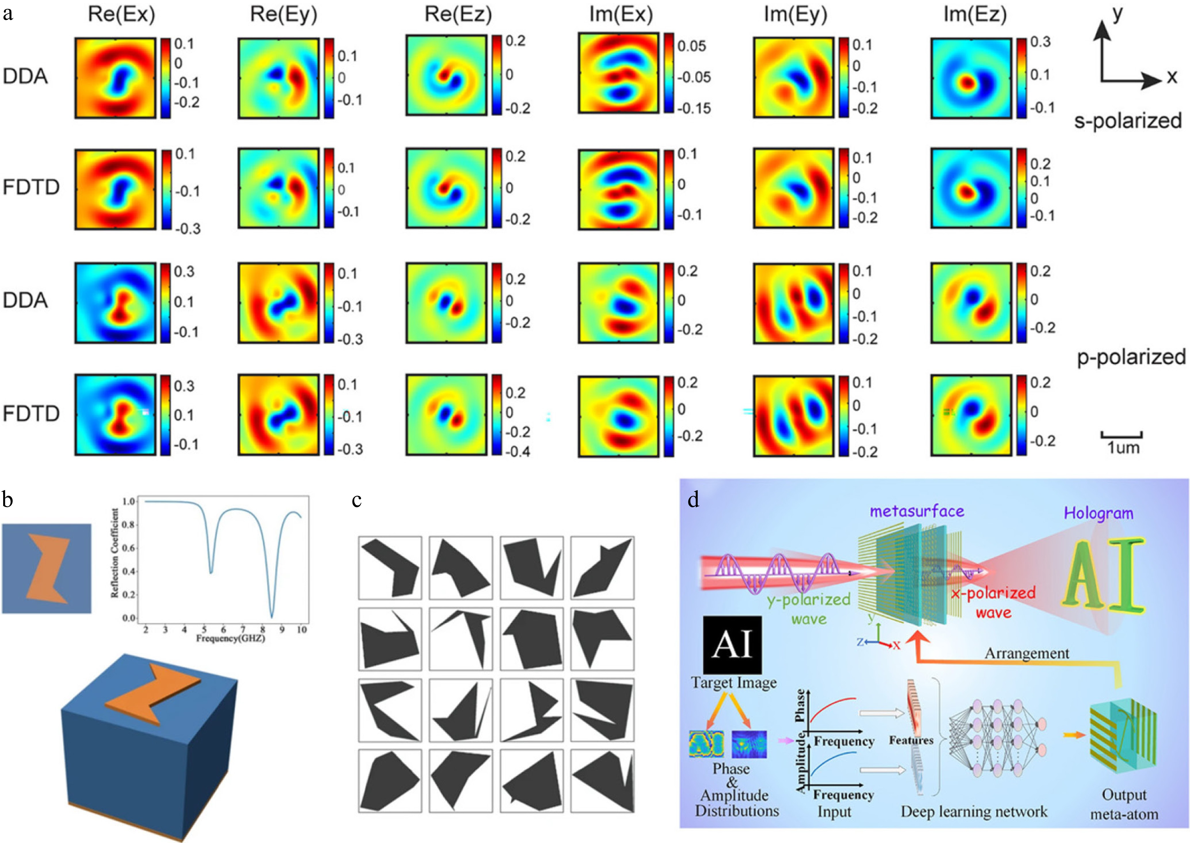 In the domain of frequency-dependent parameter prediction, linear response theory combined with first-principle simulations has been employed to systematically analyze the electromagnetic behavior of ferrite materials in the microwave regime. By mapping electronic structure characteristics to frequency-dependent permittivity and permeability, researchers can predict parameter evolution trends without extensive experimental measurements[67], providing a computational framework for performance evaluation and material screening. Similarly, Liu & McLeod developed a fast solver based on the discrete dipole approximation (DDA), which models electromagnetic-responsive media as dipole arrays, significantly reducing computational cost while preserving detailed field distributions (Fig. 6a)[68]. Spatial mapping methods (SMM) further reconstruct electromagnetic responses across multilayer structures, efficiently simulating localized field enhancements in periodic and multiscale architectures without the computational bottlenecks of conventional FDTD approaches[69].