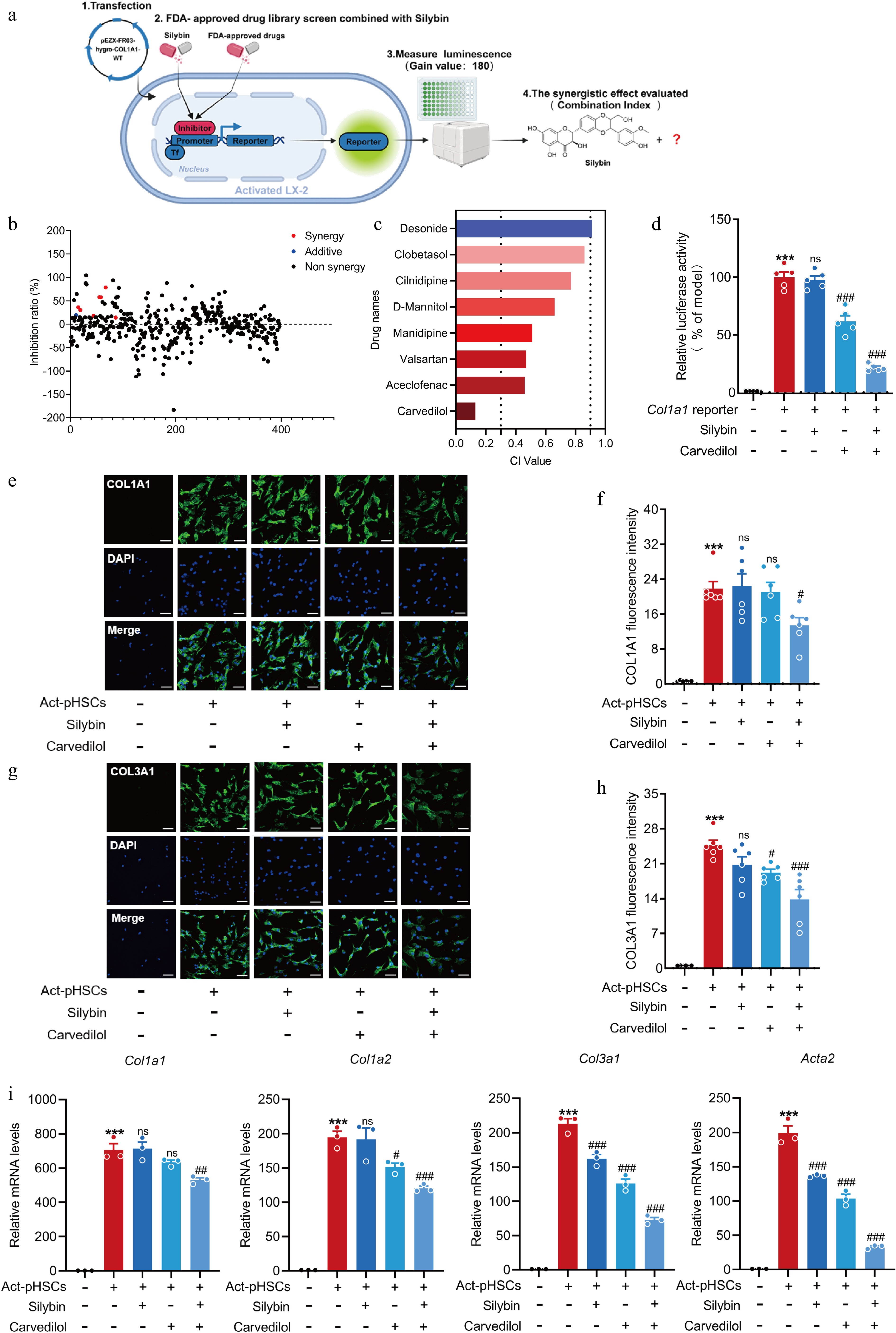 Silybin and carvedilol synergistically inhibit HSC activation. (a) Scheme about the screening system of drug combinations based on COL1A1 luciferase reporter. (b) Inhibition ration of COL1A1 luciferase by combined silybin and FDA-approved drugs. Red dots represent synergistic drugs, blue dots represent additive drugs, black dots represent non-synergistic drugs. (c) CI values by representative drugs and silybin on COL1A1 luciferase activity. (d) Relative COL1A1 luciferase activity by carvedilol and silybin in LX-2 (n = 5). (e)−(h) Representative images of immunofluorescent staining and semi-quantitative analysis of COL1A1 (e), (f) and COL3A1 (g), (h) in pHSCs (n = 6, scale bar, 50 μm). (i) Relative mRNA levels of Col1a1, Col1a2, Col3a1, Acta2 in pHSCs (n = 3). Results are present as Mean ± SEM, *** p < 0.001 vs control, # p < 0.05, ## p < 0.01, ### p < 0.001, and ns, no significance, vs model, as assessed with ANOVA.