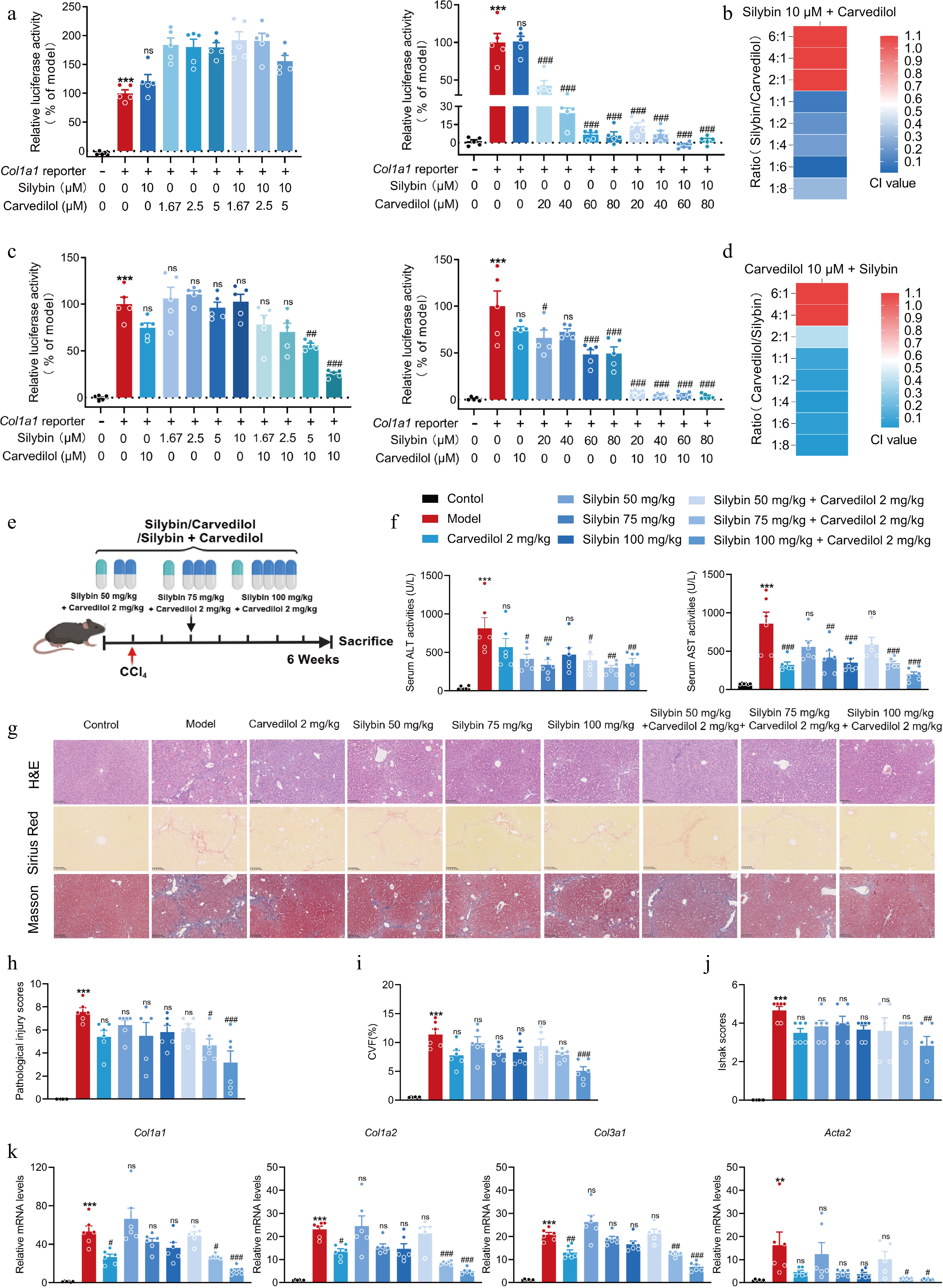 Evaluation on the dosage ratio between silybin and carvedilol to significantly synergistically inhibit HSC activation and fibrosis development. (a) Relative COL1A1 reporter luciferase activities, and (b) the CI values by combined silybin (10 μM) and carvedilol (1.67−80 μM) (n = 5). (c) Relative COL1A1 reporter luciferase activities, and (d) the CI values by combined carvedilol (10 μM) and silybin (1.67−80 μM) (n = 5). (e) Mouse experiment procedure scheme. (f) Serum ALT and AST levels (n = 6). (g) Representative images of H&E, Sirius Red, and Masson staining of liver sections (n = 6, scale bar, 100 μm). (h) Pathological injury scores on H&E staining of liver sections (n = 6). Liver fibrosis analysis by (i) CVF, and (j) Ishak scores of the Masson staining of liver sections (n = 6). (k) mRNA levels of fibrotic genes (n = 6). Results are present as Mean ± SEM, ** p < 0.01, *** p < 0.001 vs control, # p < 0.05, ##p < 0.01,### p < 0.001, and ns, no significance, vs model, as assessed with ANOVA.