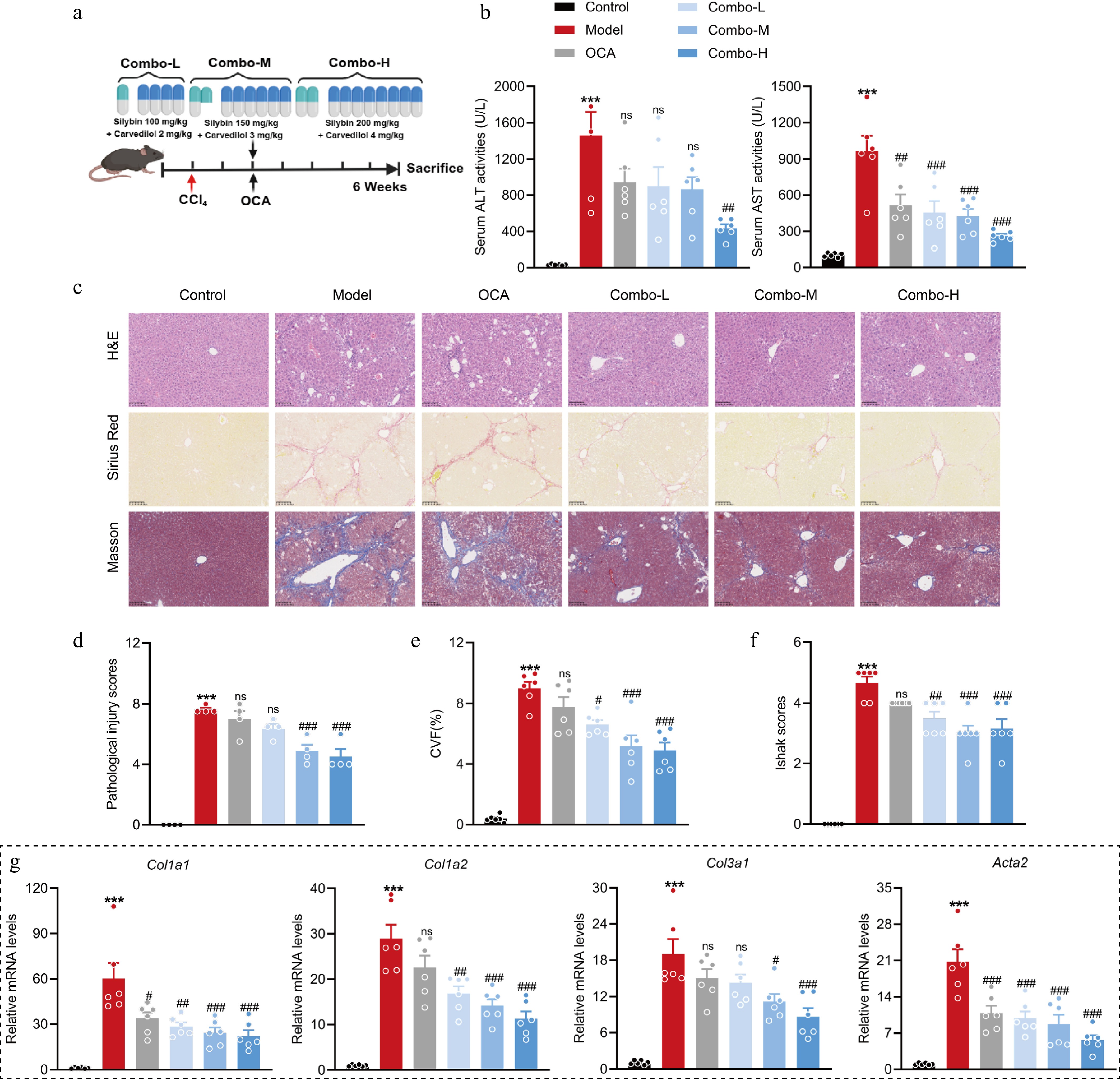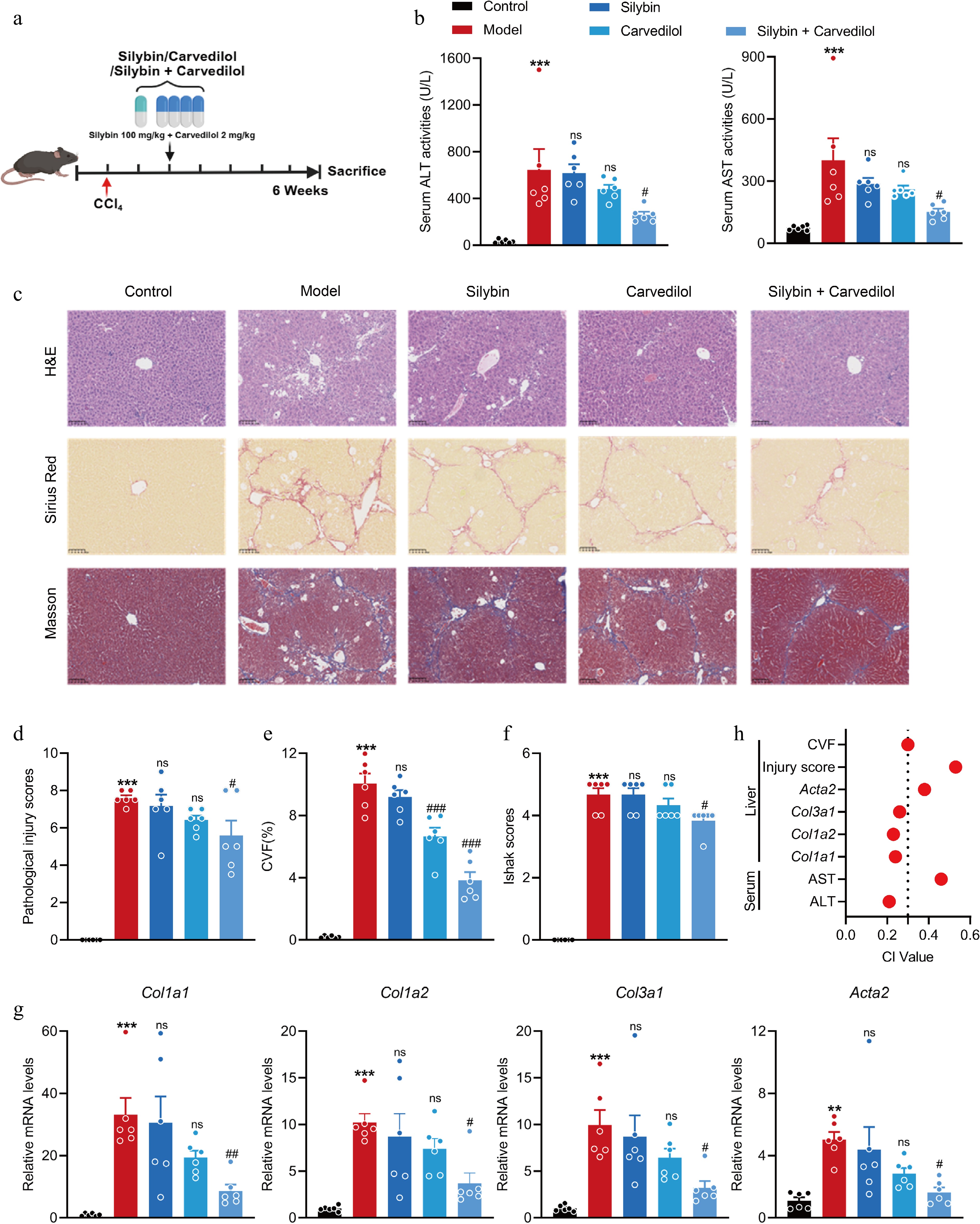 Combined silybin and carvedilol significantly attenuates CCl4-induced liver fibrosis. (a) Mouse experiment procedure scheme. (b) Serum ALT and AST levels (n = 6). (c) Representative images of H&E, Sirius Red, and Masson staining of liver sections (n = 6, scale bar, 100 μm). (d) Pathological injury scores on H&E staining of liver sections (n = 6). Liver fibrosis analysis by (e) CVF, and (f) Ishak scores on Masson staining of liver sections (n = 6). (g) The mRNA levels of fibrotic genes (n = 6). (h) CI values of above indicators. Results are present as Mean ± SEM, ** p < 0.01, *** p < 0.001 vs control, # p < 0.05, ## p < 0.01, ### p < 0.001, and ns, no significance, vs model, as assessed with ANOVA.