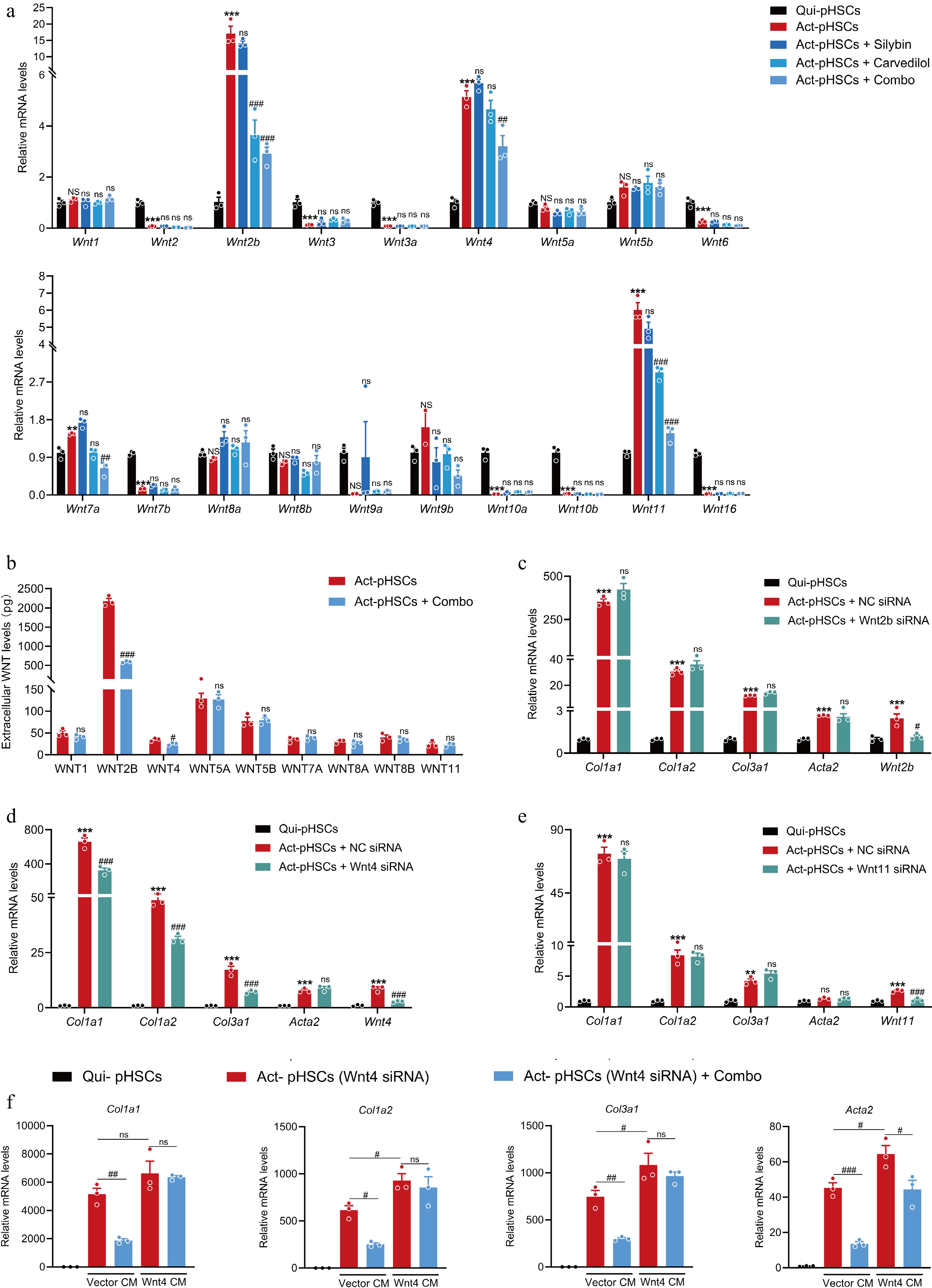 The combination of silybin and carvedilol inhibits HSC activation by suppressing WNT4. (a) The mRNA expression of 19 Wnt ligands in pHSCs treated with individual or combined silybin and carvedilol (n = 3). (b) Extracellular protein levels of main Wnt ligands in pHSCs (n = 3). mRNA expression of pro-fibrotic genes in pHSCs treated with either (c) Wnt2b siRNA, (d) Wnt4 siRNA or (e) Wnt11 siRNA (n = 3). (f) The mRNA expression of pro-fibrotic genes in pHSCs (Wnt4 knocked down) incubated with conditioned medium collected from HEK293T cells transfected with Vector plasmid (Vector CM) or Wnt4-overexpressing plasmid (Wnt4 CM) (n = 3). Results are presented as Mean ± SEM, * p < 0.05, ** p < 0.01, *** p < 0.001, and ns, no significance, vs control, # p < 0.05, ## p < 0.01,### p < 0.001, and ns, no significance, vs model, as assessed with ANOVA or t-test.