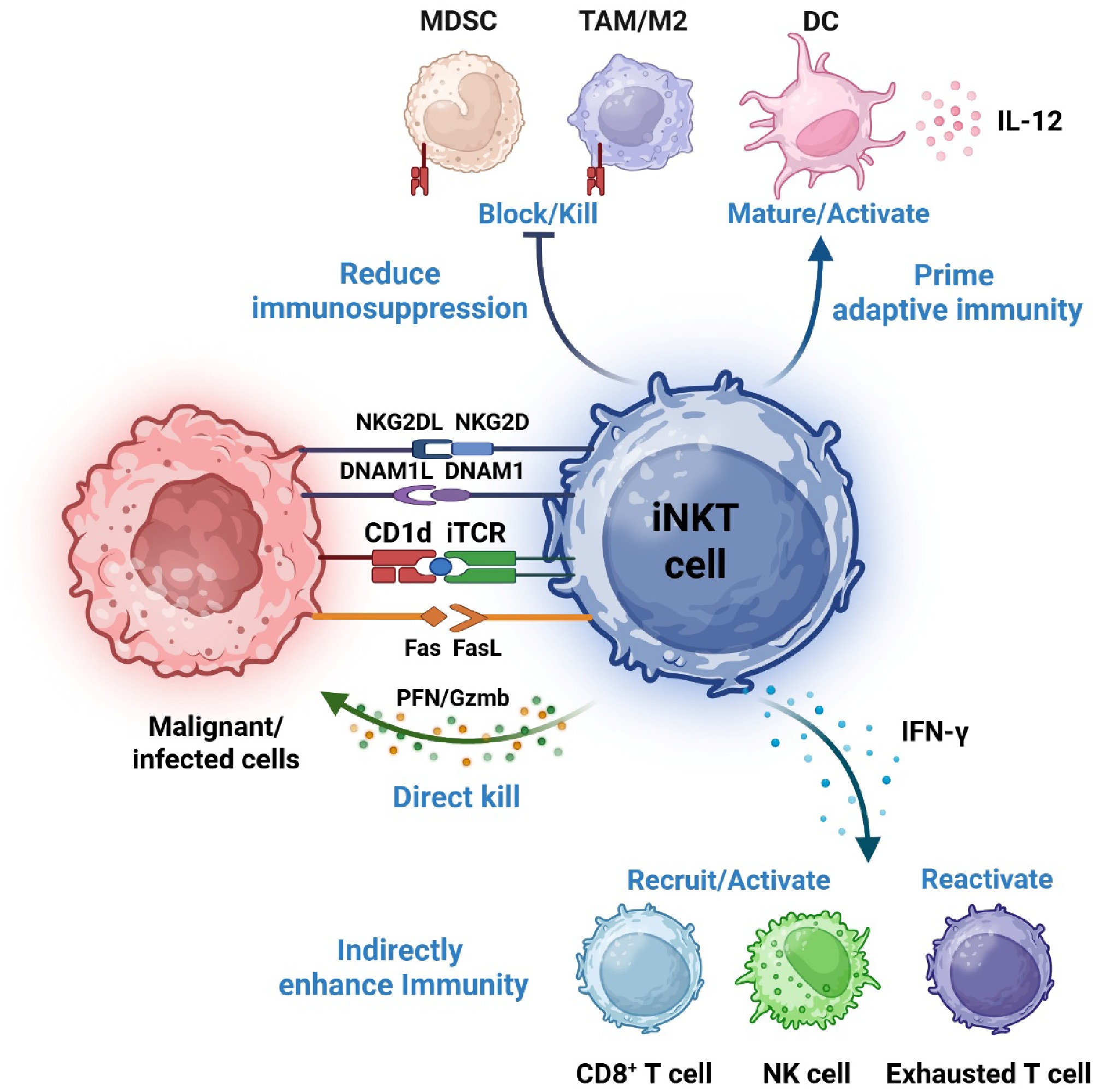 Mechanisms of iNKT cell-mediated anti-viral and anti-cancer immunity. iNKT cells identify stressed and dying cells via T-cell receptor (TCR)-mediated recognition of endogenous CD1d-presented lipid antigens, as well as engagement of NKG2D and DNAM-1 ligands. Upon activation, iNKT cells directly eliminate target cells and secrete abundant cytokines. These cytokines subsequently recruit and activate additional immune effectors, thereby intensifying anti-pathogen and anti-tumor responses. Additionally, iNKT cells can suppress immuno-regulatory myeloid cells, including macrophages and myeloid-derived suppressor cells (MDSCs), further bolstering immune activation.