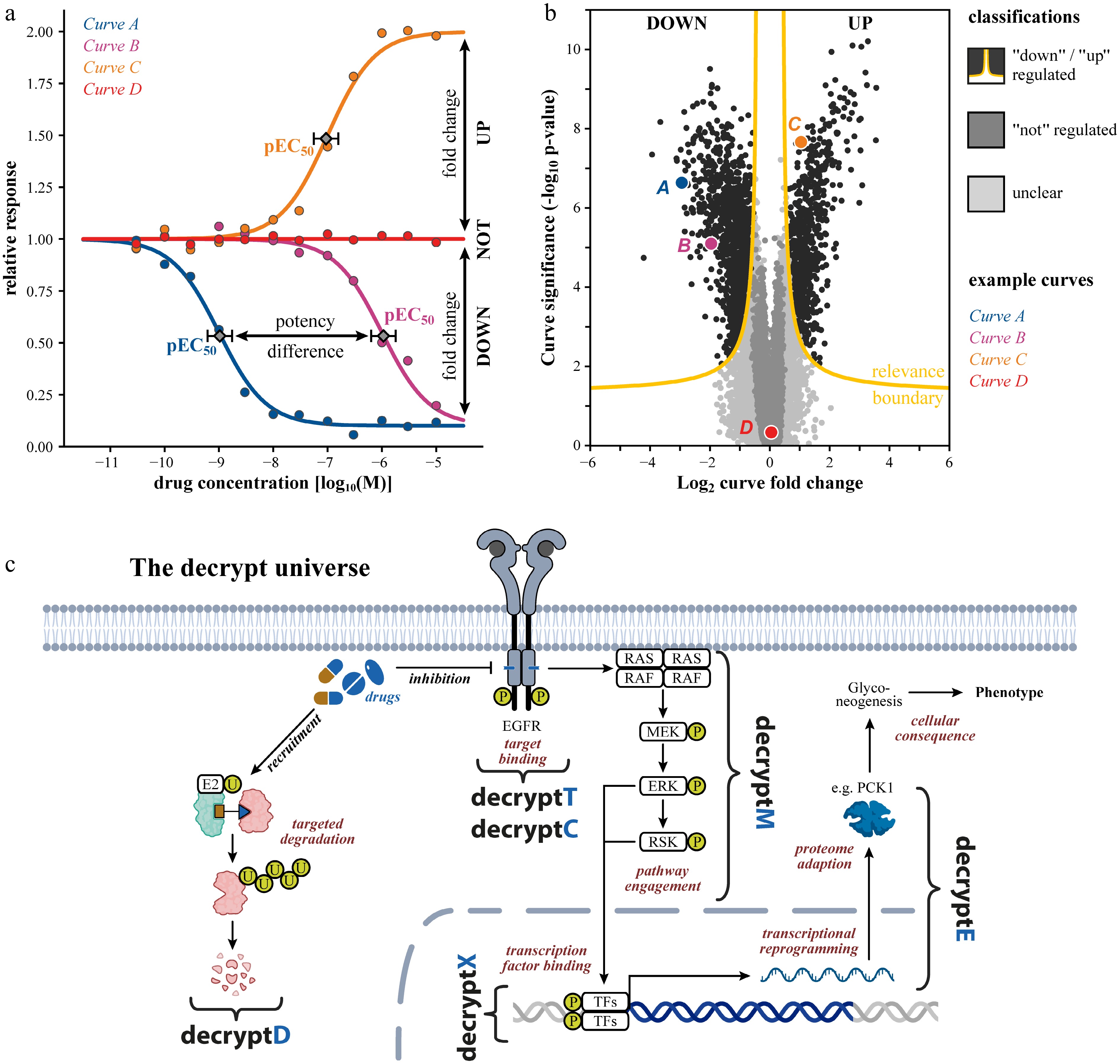 Tracing drug mechanism of action by dose-dependent proteome- and PTM-wide measurements. (a) Schematic dose response curves illustrating extraction of pEC50: −log10 effective drug concentration to achieve 50% of the maximal effect as quantitative measures of target or pathway potency. (b) Example volcano plot of a typical omics dose-response dataset, where each data point is a dose-response curve. The relevance boundary (combination of fold change and alpha threshold) identifies down- and up-regulated responses with false discovery rate (FDR) control. (c) Schematic of how a drug's mechanism unfolds in a cell: target binding or degradation (decryptT/decryptC/decryptD), pathway engagement (decryptM/decryptX), proteome reprogramming (decryptE), and ultimately cellular consequences. TFs: transcription factors.