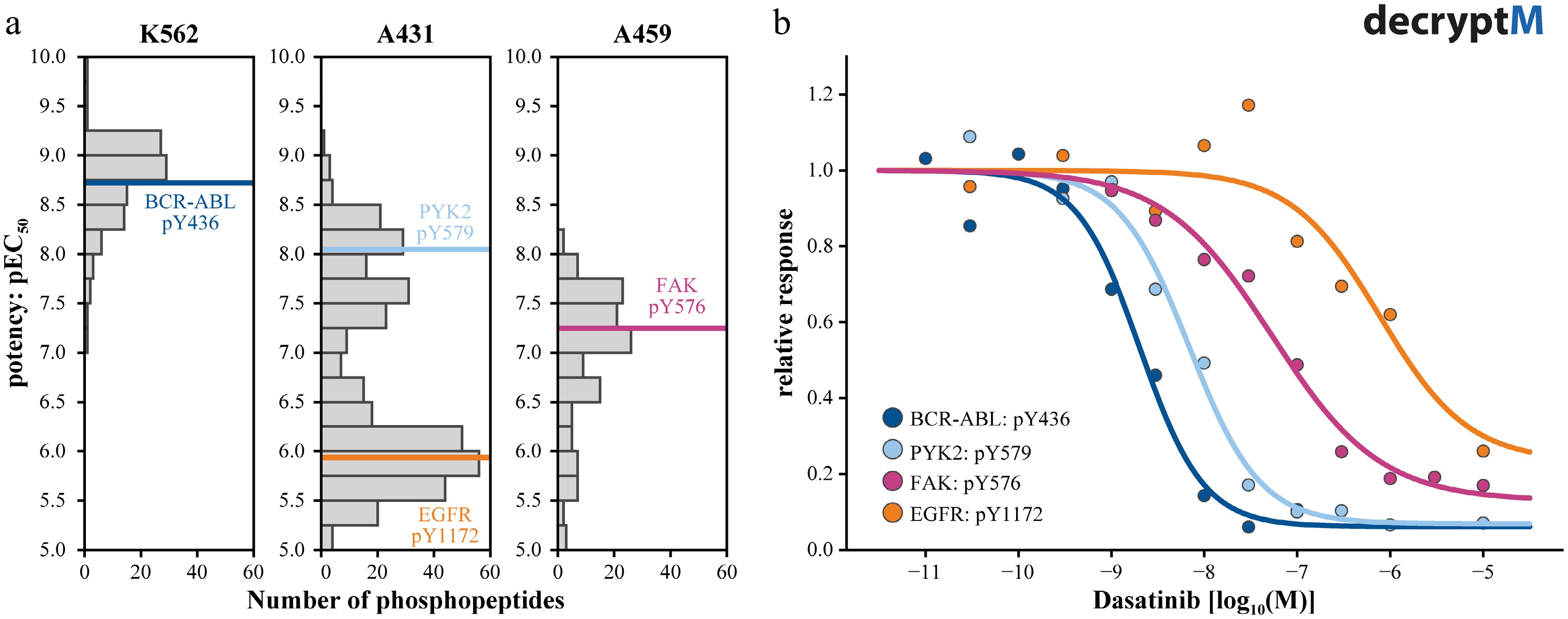 The value of decryptM experiments is exemplified in Fig. 3 for the multi-kinase inhibitor Dasatinib. The drug is a very potent (~1 nM) designated BCR-ABL inhibitor used for the treatment of BCR-ABL positive chronic myeloid leukemia (CML), but it also has additional targets with various potencies. Figure 3a summarizes the distributions of phosphosite potencies across three cancer cell lines. Following the logic above, most drug-regulated phosphorylation sites in the CML cell line, K562, have similar potencies and are all downstream of the driver kinase BCR-ABL. In the cutaneous squamous cell carcinoma, A431, which is driven by a genomic EGFR amplification, the picture is entirely different because Dasatinib is only a weak EGFR inhibitor (~1 µM), which is why most drug regulated phosphopeptides cluster around that concentration. Yet another profile is observed for KRAS-mutated A549 lung carcinoma epithelial cells because Dasatinib inhibits a range of kinases in this cell line that are not necessarily present in others.