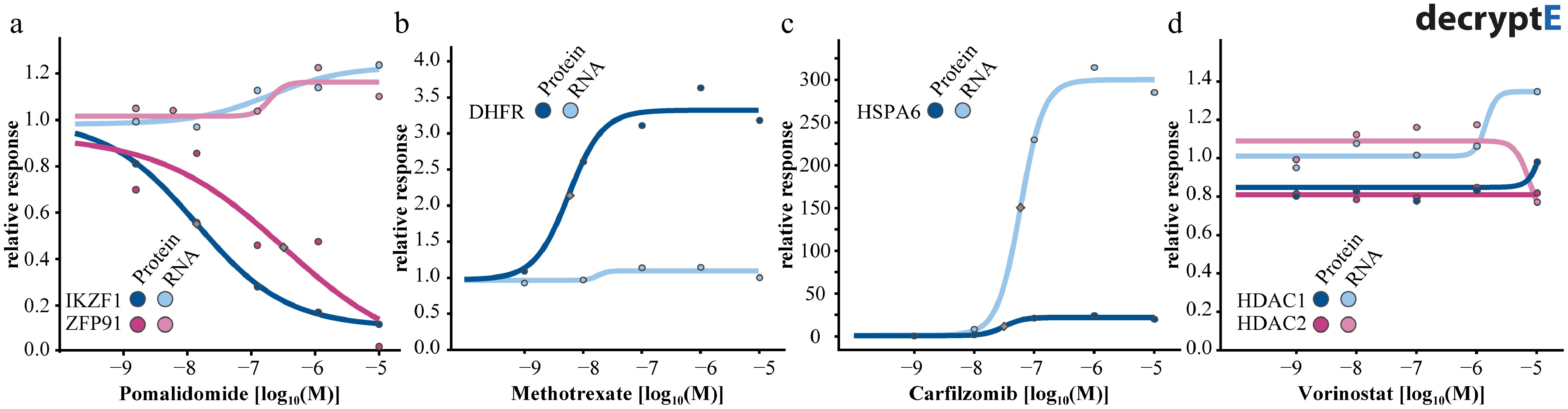 Dose-response curves for proteins and their mRNA transcripts for (a) the degrader pomalidomide, (b) the DHFR inhibitor methotrexate, (c) the proteoasome inhibitor carfilzomib, and (d) the HDAC1-3 inhibitor vorinostat.