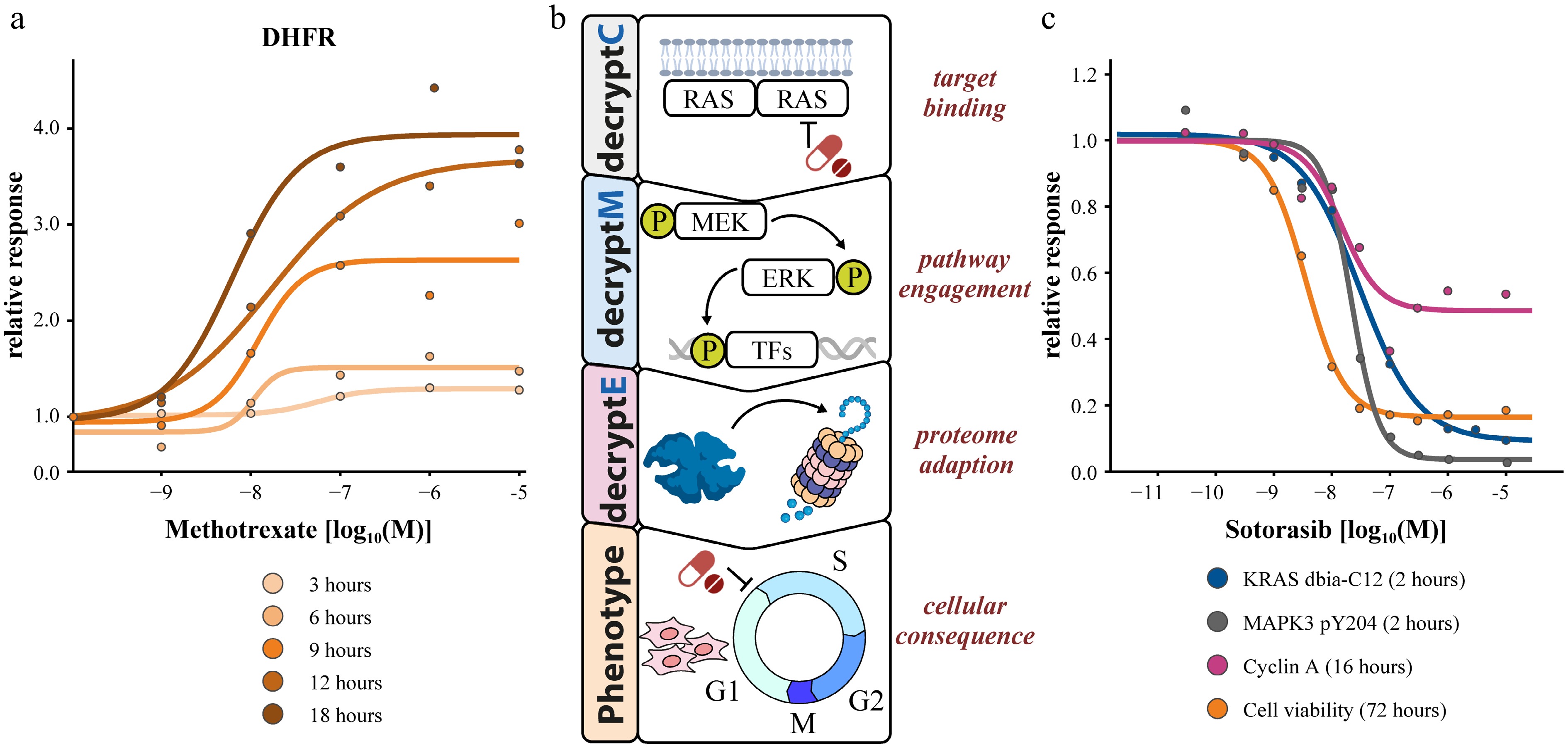 Multi-dimensional dose-response measurements. (a) 2D time-dose coupling of DHFR abundance changes in response to methotrexate. (b) Multi-decrypt-dimension profiling of the KRAS inhibitor sotorasib revealing potency coherence at all levels of MoA elucidation.