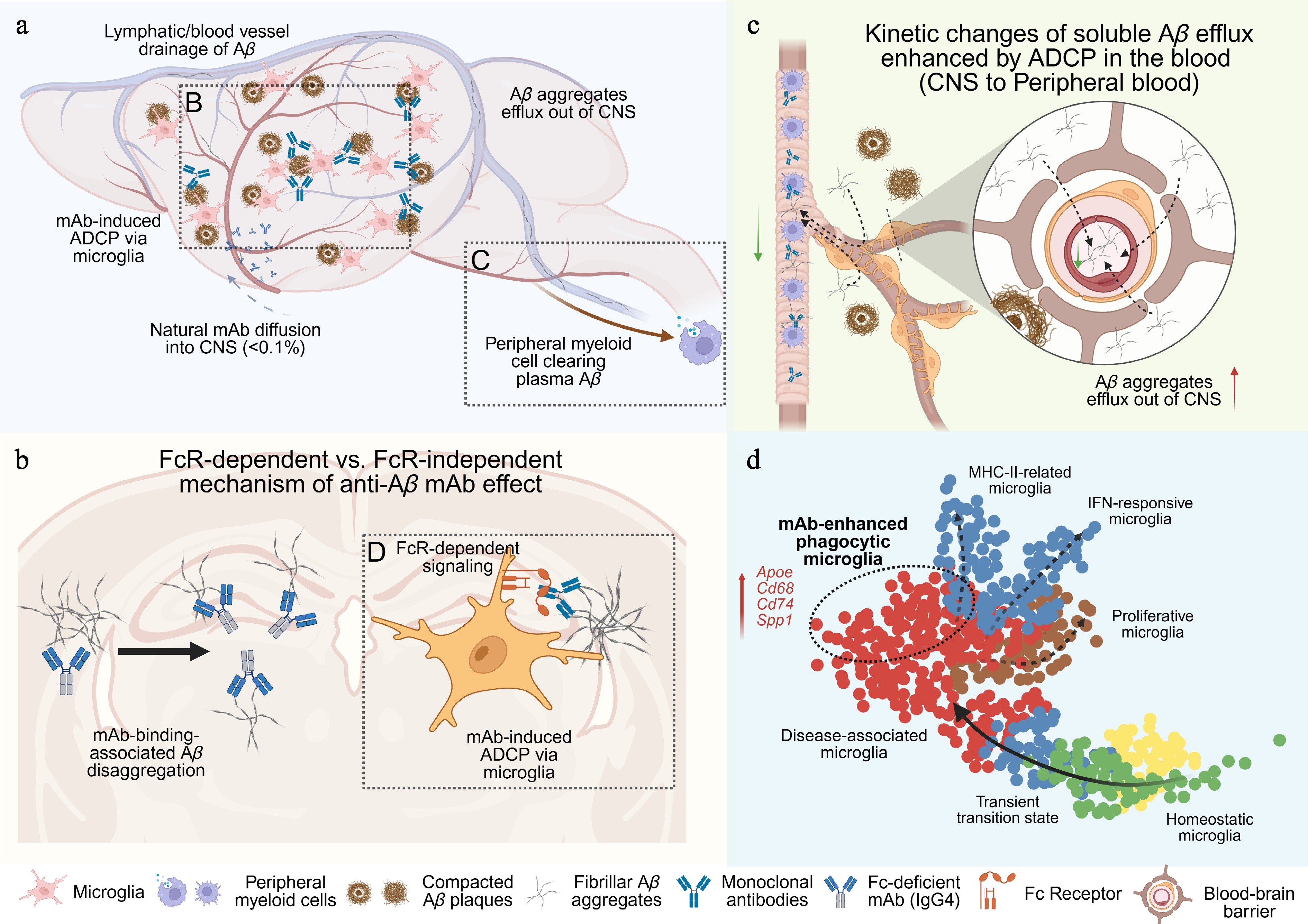 • In the last two years, two anti-amyloid-β (Aβ) monoclonal antibodies (lecanemab and donanemab, commercially as Lequmbi and Kisunla) have been approved by the FDA for the treatment of Alzheimer's disease (AD), following aducanumab[1,2]. Clinical success soon demonstrated anti-Aβ immunotherapy as one of the most effective treatments to slow AD progression for now. Although the Aβ-tau-neurodegeneration cascade hypothesis still cannot fully explain AD disease pathogenesis[3], the clinical benefits from these antibodies showed that amyloid removal can successfully slow down cognitive decline in patients with AD. These results further highlight the necessity to include Aβ PET imaging in diagnostic criteria to identify appropriate candidates before the treatment[4,5]. To date, progress in this area has involved a large amount of research into what Aβ species are actually the therapeutic targets; early failures to target monomers led to later successes with specific aggregates or plaque-associated Aβ[6,7]. However, it turns out that the cellular and molecular mechanisms behind how anti-Aβ antibodies remove amyloid aggregates are much more complicated than we thought, where multiple biological processes are just revealed in a tangled system (Fig. 1a).