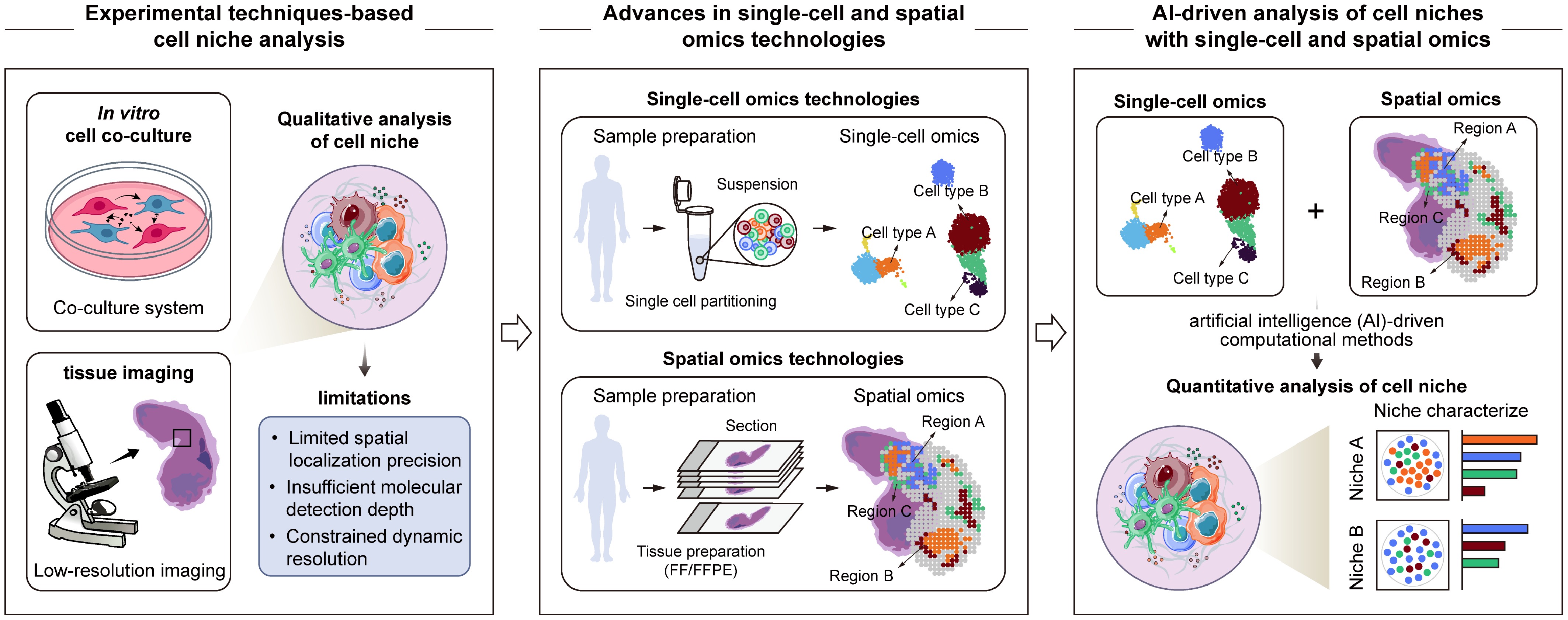• The therapeutic effects of traditional Chinese medicine (TCM) are characterized by holistic and systematic regulation of the organism, typically achieved through coordinating tissue microenvironments and multicellular interactions. However, conventional molecular biology approaches struggle to precisely characterize cellular composition, spatial architecture, and associated microenvironment (cell niche) at the tissue level, constraining a comprehensive understanding of the mechanism of action of TCM. In recent years, the rapid advancement of single-cell and spatial omics technologies, together with artificial intelligence (AI)-driven computational methods, has enabled systematic deciphering of cell niches within complex tissues, offering new opportunities for TCM research. Centered on the cell niche, this review outlines its conceptual development and research progress, with a particular focus on recent advances in AI-assisted cell niche analysis based on single-cell and spatial omics data. We further summarize representative scenarios of cell niche analysis in TCM research, while discussing current challenges and future directions, highlighting its potential to provide a new perspective and analytical paradigm in TCM.