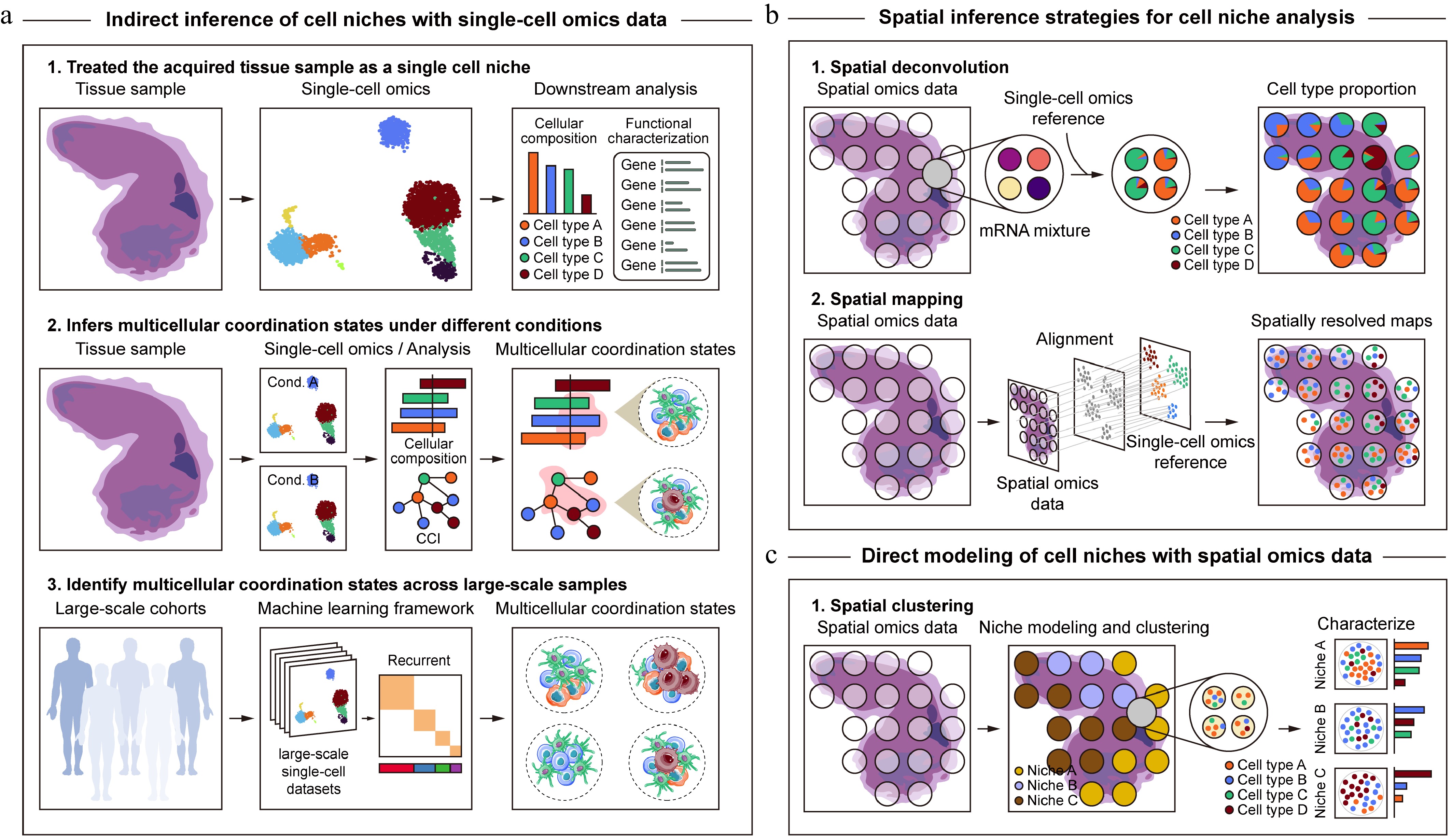 From a methodological perspective, indirect inference methods based on single-cell omics data require only single-cell datasets and are therefore broadly applicable. However, due to the lack of explicit spatial context, these approaches provide a relatively coarse and indirect characterization of cell niches. As such, these approaches are more suitable for preliminary characterization of cell niches, large-scale cohort studies, and cross-condition comparisons. Spatial inference strategies, including spatial deconvolution and spatial mapping methods, integrate single-cell and spatial omics data to reconstruct spatial patterns of cellular composition and gene expression. Compared with indirect inference driven by single-cell data, these approaches offer more intuitive and refined descriptions of composition and molecular features of cell niches, with generally strong interpretability and direct links to known biological knowledge. Nevertheless, their performance critically depends on the quality of the single-cell reference, and the delineation of cell niches remains indirect and constrained by existing biological priors. In contrast, direct modeling strategies, represented by spatial clustering methods, explicitly treat the cell niche as the fundamental unit of analysis and identify potential cell niches in a data-driven manner, making them particularly suitable for discovering previously uncharacterized cell niches in complex tissues. However, as these approaches are typically based on unsupervised learning frameworks, their results can be sensitive to parameter selection and data noise, resulting in relatively limited interpretability.