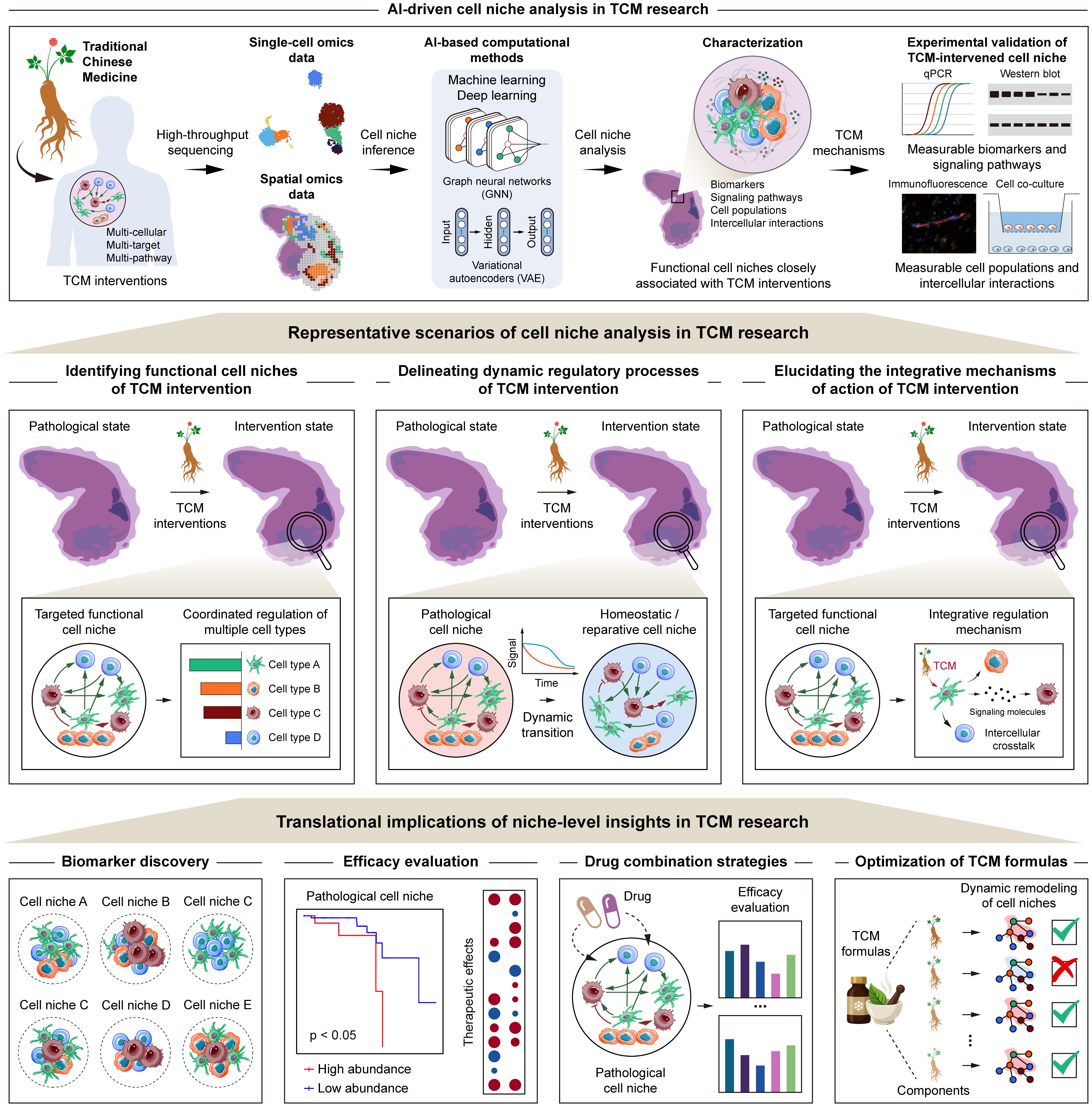 • To facilitate the broader application of cell niche analysis in TCM research, future efforts are expected to prioritize critical bottlenecks that currently limit its translational potential in biomarker discovery, drug mechanism elucidation, therapeutic efficacy evaluation, and other pharmacological applications. Overall, these bottlenecks can be summarized into three key aspects: (1) improving the biological interpretability and experimental verifiability of cell niches as the functional multicellular targets; (2) enhancing the robustness, reproducibility, and generalizability of AI-driven cell niche analysis methods across datasets, platforms, and tissue contexts; and (3) establishing high-quality, publicly available single-cell and spatial omics data resources and analysis frameworks tailored for TCM research.