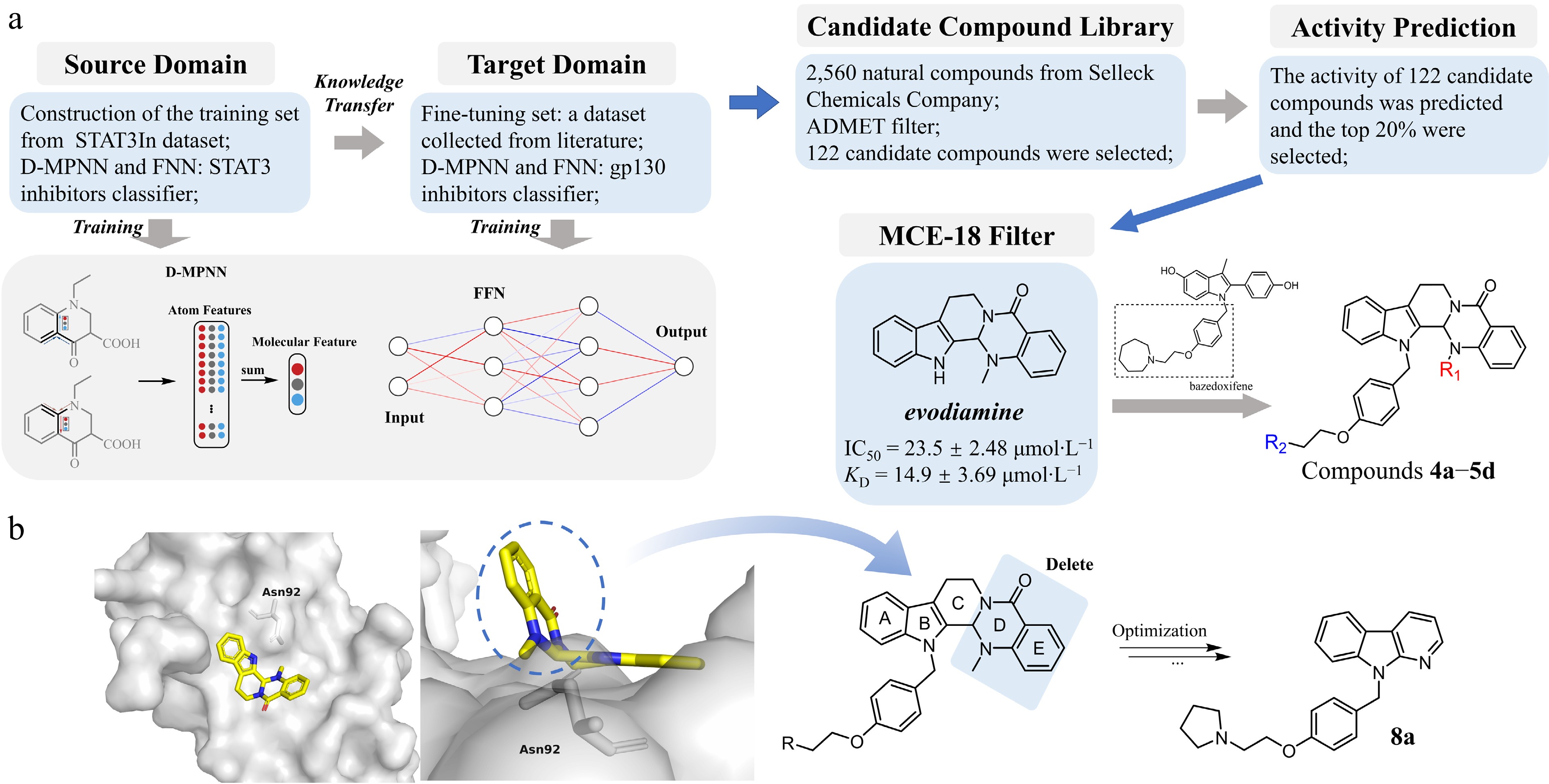 Design strategy and structure optimization of novel gp130-targeting compounds. (a) Preliminary identification of lead compounds. A transfer learning strategy was adopted to construct a gp130 inhibitor classification model integrating a Directed Message Passing Neural Network (D-MPNN) and a Feedforward Neural Network (FNN). After pretraining on the known STAT3 inhibitor (source Domain), the pretrained model was fine-tuned using the gp130-related compounds (Target Domain) to create the final gp130 inhibitor classifier. This classifier was then used to screen a library of 2,560 natural compounds. After ADMET screening, 122 candidate drugs with relatively high activity scores were obtained. These candidate drugs were further evaluated through the MCE-18 index, and ultimately evodiamine was selected as the primary hit. It shows weak anti-tumor activity and binding affinity with gp130 against colorectal cancer HT-29 cells (with the IC50 of 23.5 ± 2.48 µmol·L−1, and the KD of 14.9 ± 3.69 µmol·L−1). A hybridization strategy combining the evodiamine scaffold with the linker moiety from bazedoxifene led to the synthesis of derivative series 4a5d. (b) Structural optimization based on anti-tumor activity at the cellular level. Left panel (front and top view): Molecular docking of evodiamine with the gp130 D1 domain reveals its binding pose and key interactions, providing a structural basis for modification. Based on the docking analysis (right panel) and supported by in vitro antitumor activity data, iterative structural modifications were performed on the evodiamine-bazedoxifene hybrid scaffold. This rational design process ultimately yielded the optimized candidate compound 8a.