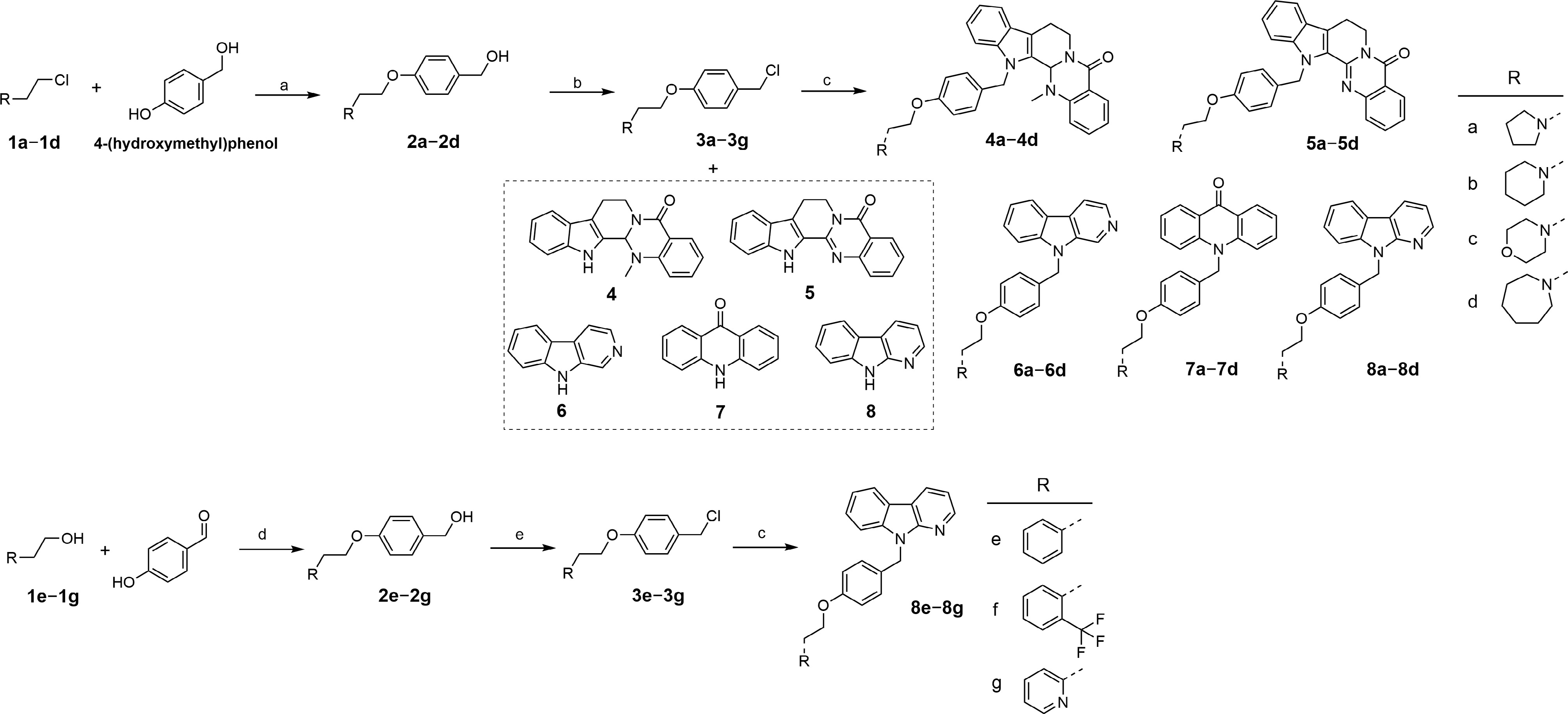 • As depicted in Fig. 2, the target compounds were synthesized via two distinct pathways, depending on the substituent R. For the synthesis of analogues bearing aliphatic heterocycles, nucleophilic substitution of chlorides 1a1d with 4-(hydroxymethyl) phenol was performed under phase-transfer conditions (NaOH, TBAB) to yield alcohols 2a2d. These intermediates were converted to the corresponding benzyl chlorides 3a3d using thionyl chloride, followed by N-alkylation with scaffolds 48 to afford the final compounds 4a8d. Conversely, for the aromatic series, alcohols 1e1g were coupled with 4-hydroxybenzaldehyde via a Mitsunobu reaction, followed by in situ reduction with NaBH4 to provide benzyl alcohols 2e2g. Subsequent chlorination with SOCl2 yielded intermediates 3e3g, which underwent nucleophilic substitution with 9H-pyrido[2,3-b] indole to produce compounds 8e8g. The final compounds were confirmed by IR, HRMS (ESI), 1H NMR, and 13C NMR.