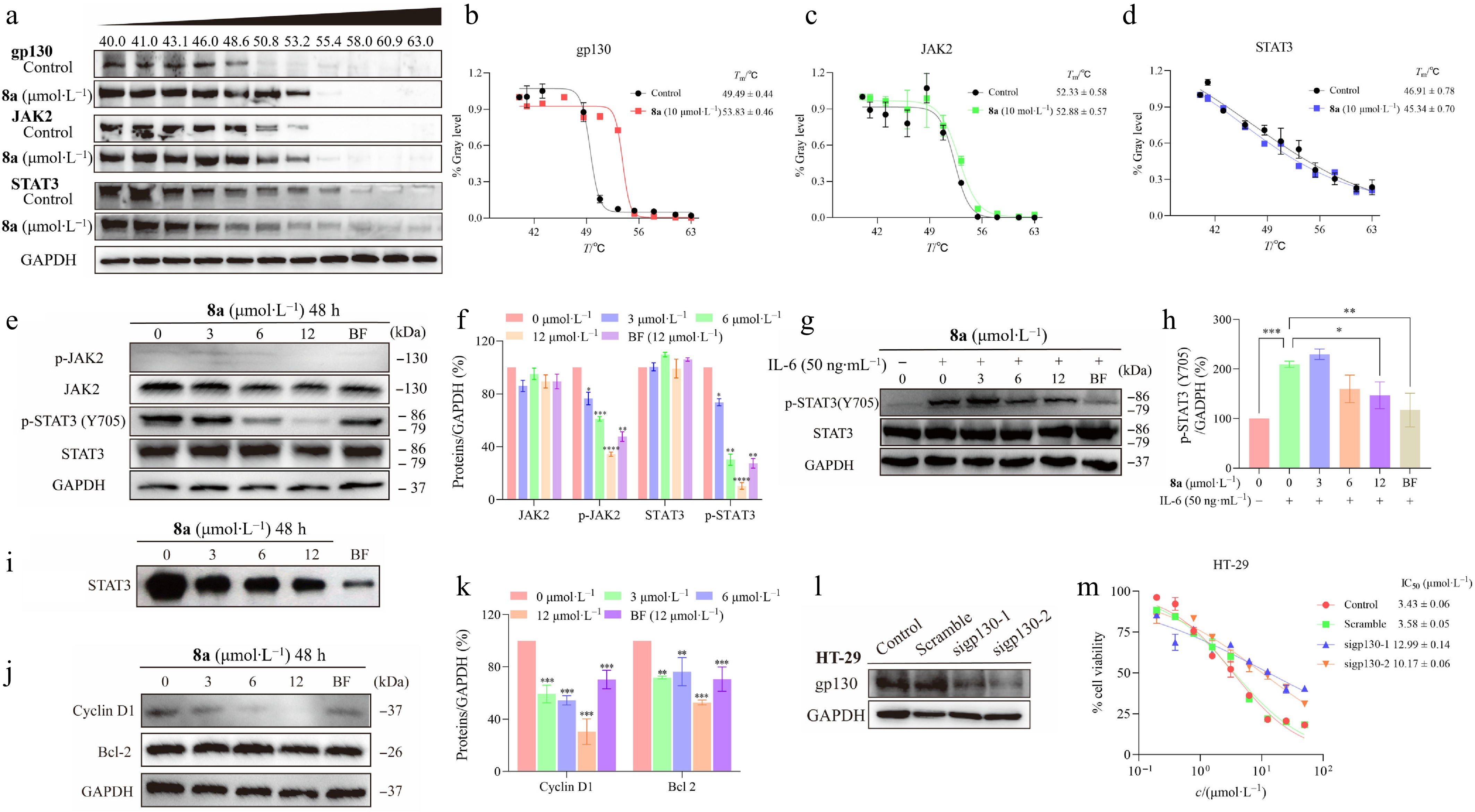 • HT-29 cells were seeded in 10 cm culture dishes and cultured until they reached 70%−80% confluence. The cells were treated with compound 8a or DMSO for 1 h and then collected. The cells were resuspended in PBS (containing 1 × protease inhibitor) and divided into 11 aliquots, each with a volume of 28 μL. A gradient temperature (40−60 °C) was set in the PCR instrument within 8 min, and then rapidly cooled. The samples were subjected to three freeze-thaw cycles in liquid nitrogen, followed by centrifugation at 12,000 r·min−1 for 10 min at 4 °C to collect the supernatant. The abundance of gp130, JAK2, and STAT3 proteins was detected by Western blotting, and the Tm values were analyzed using Image J and fitted with GraphPad Prism software.
