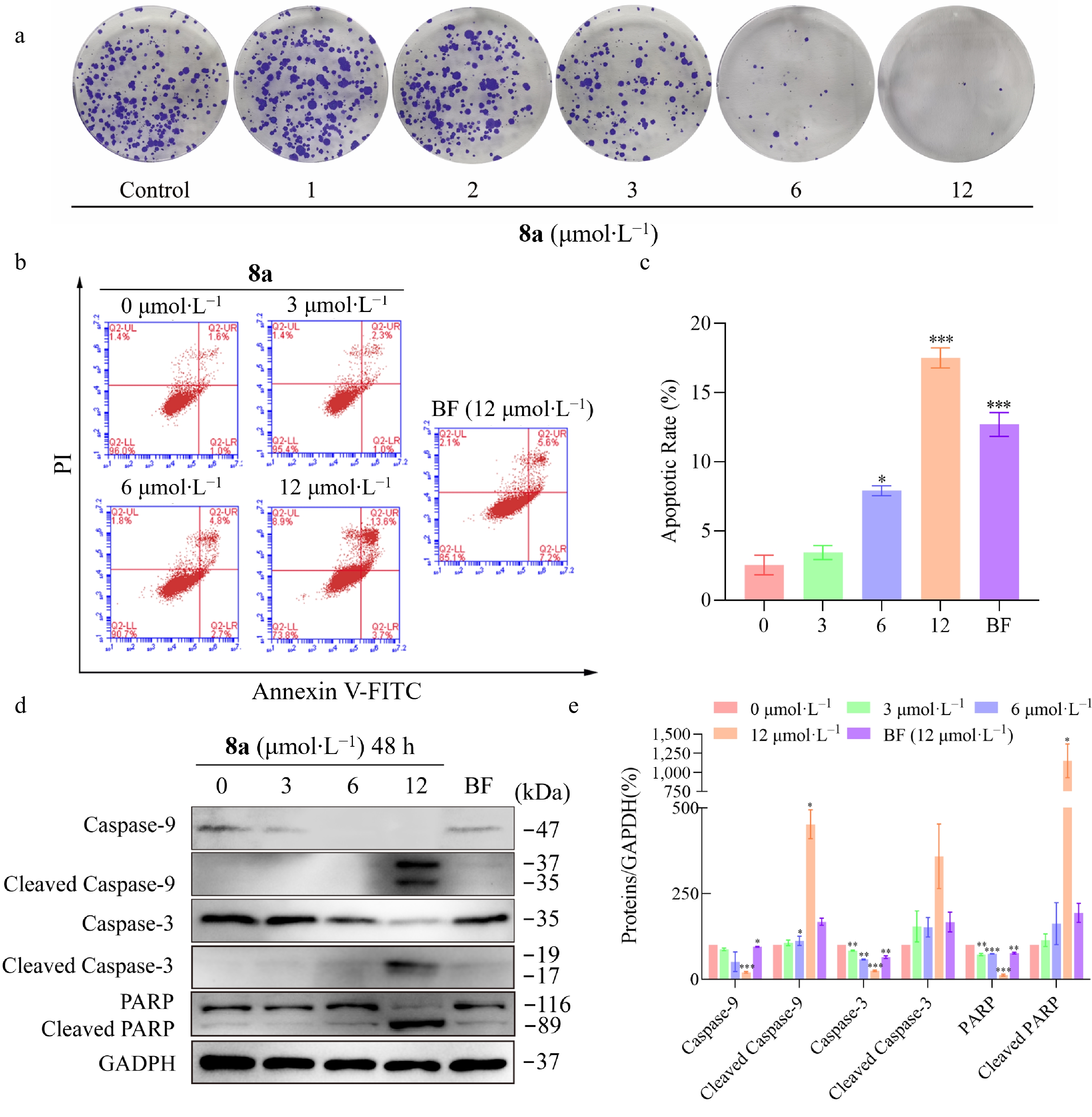 Compound 8a inhibits HT-29 cell proliferation and induces apoptosis. HT-29 cells were treated with compound 8a or BF at the tested concentrations for 48 h. (a) Compound 8a inhibited the proliferation of HT-29 cells in vitro. (b) Apoptotic effects were detected via Annexin V-FITC/PI staining and flow cytometry. (c) Histograms of the percentage of apoptotic cells (early and late stages of apoptosis). (d) Effects of compound 8a or BF on the protein levels of Caspase-9, Cleaved Caspase-9, Caspase-3, Cleaved Caspase-3, PARP, and Cleaved PARP. The cell lysates were harvested and analyzed via Western blot with the corresponding antibodies. (e) Quantitative analysis of the western blot results via the Image Lab program, with GAPDH serving as the internal control. Data are presented as the mean ± SEM (n = 3). ** P < 0.01 *** P < 0.001.
