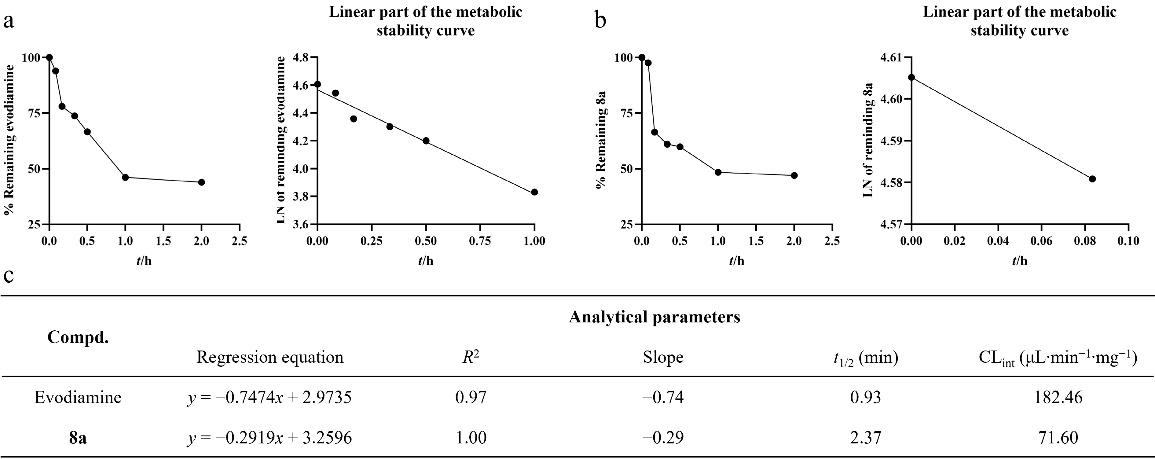 Metabolic stability of evodiamine and 8a in rat liver microsomes (RLM). (a) The metabolic stability curve of evodiamine in RLM within 2 h and the regression equation of the linear part of the curve. (b) The metabolic stability curve of 8a in RLM within 2 h and the regression equation of the linear part of the curve. (c) Key parameters for the metabolic stability of evodiamine and 8a.